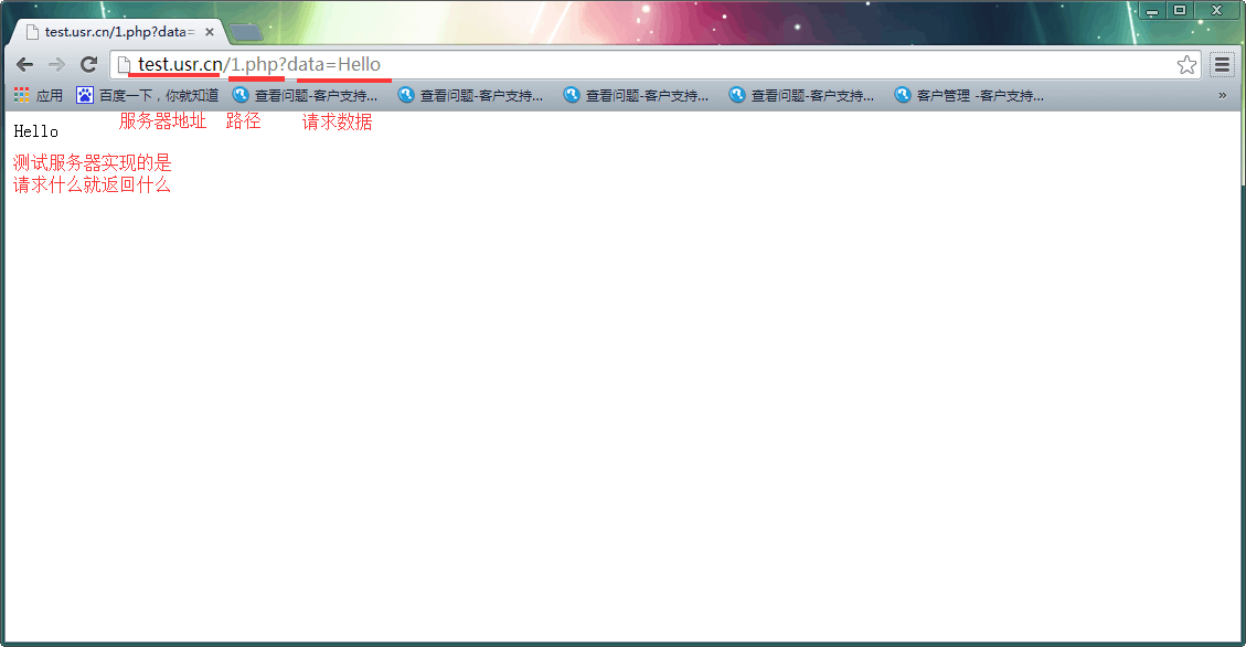 1:通過瀏覽器以GET的方法向服務(wù)器提交數(shù)據(jù)Hello。