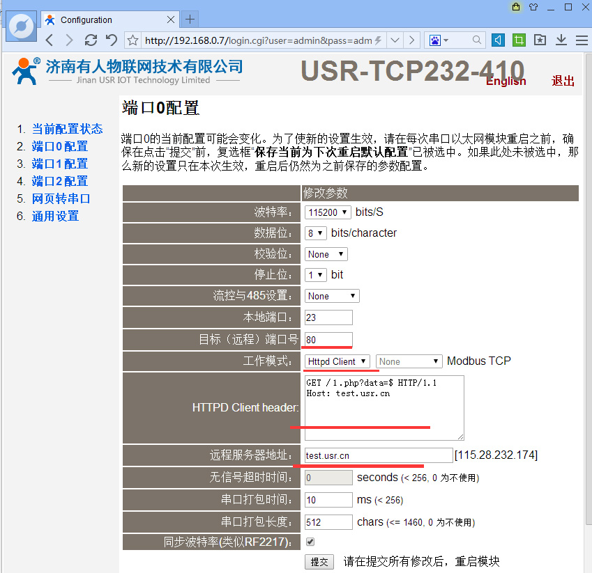 2:在串口0設(shè)置工作方式為Httpd Client .目標(biāo)端口為http端口80,遠程服務(wù)器為服務(wù)器IP:test.usr.cn