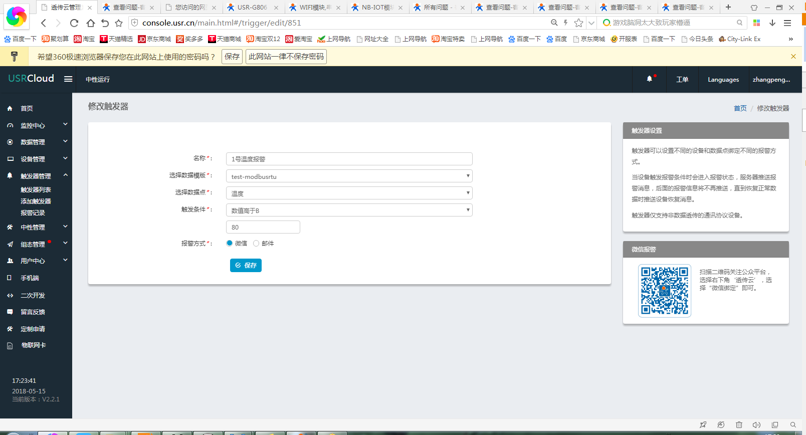 12、關注有人物聯網公眾號,點擊右下角透傳云,登錄賬號,報警信息可以推送至微信
