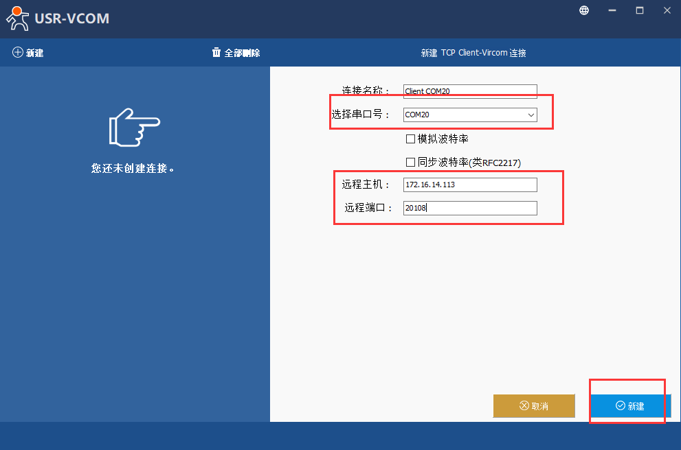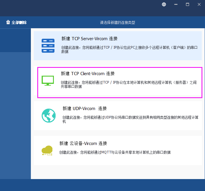 打開(kāi)下載好的VCOM軟件,點(diǎn)擊新建TCP-Client-Vircom連接