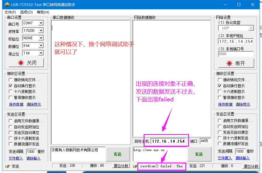 有時候小黃人網絡端出錯,建立不了連接。有可能是調試軟件的問題,換個網絡調試助手就可以了