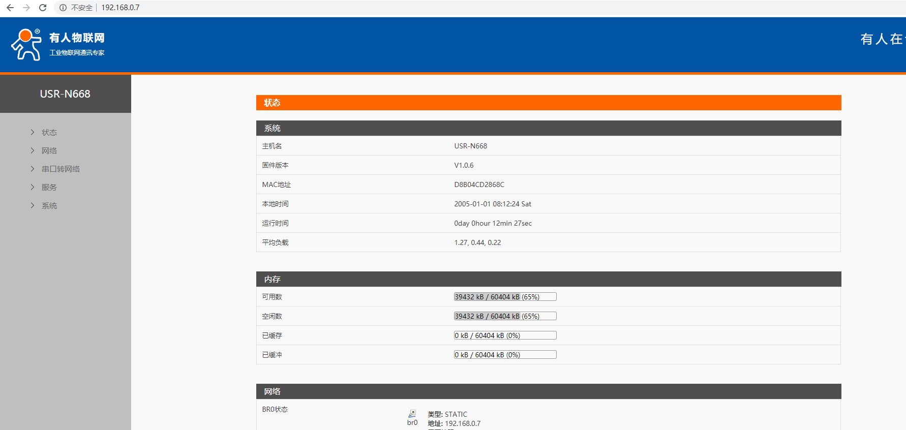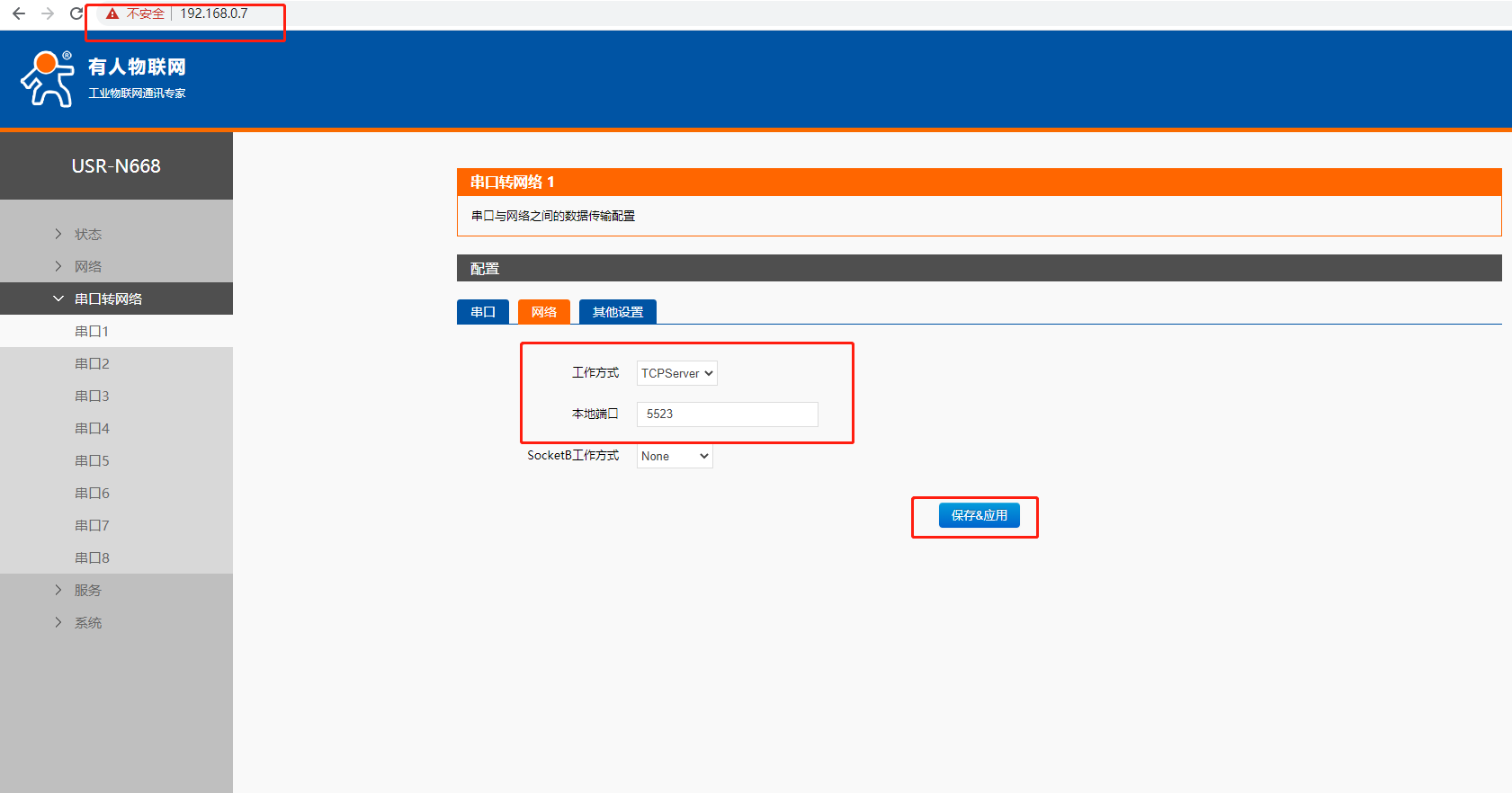 4、打開(kāi)瀏覽器,瀏覽器輸入IP:192.168.0.7進(jìn)入N668的內(nèi)置網(wǎng)頁(yè),用戶名密碼默認(rèn)為admin,模塊工作方式設(shè)為T(mén)CP SERVER,本地端口5523,點(diǎn)擊保存參數(shù)。重啟設(shè)備完成設(shè)置。