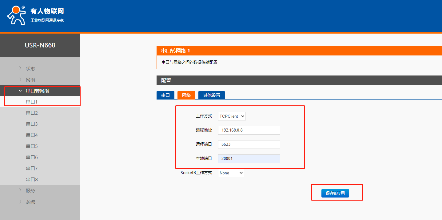 5、通過(guò)內(nèi)置網(wǎng)頁(yè)進(jìn)入另一臺(tái)N668的配置,點(diǎn)為了防止IP沖突,將此設(shè)備IP修改為192.168.0.8,模塊工作方式設(shè)為T(mén)CP Client,本地端口0,遠(yuǎn)程端口5523,點(diǎn)擊保存參數(shù)。