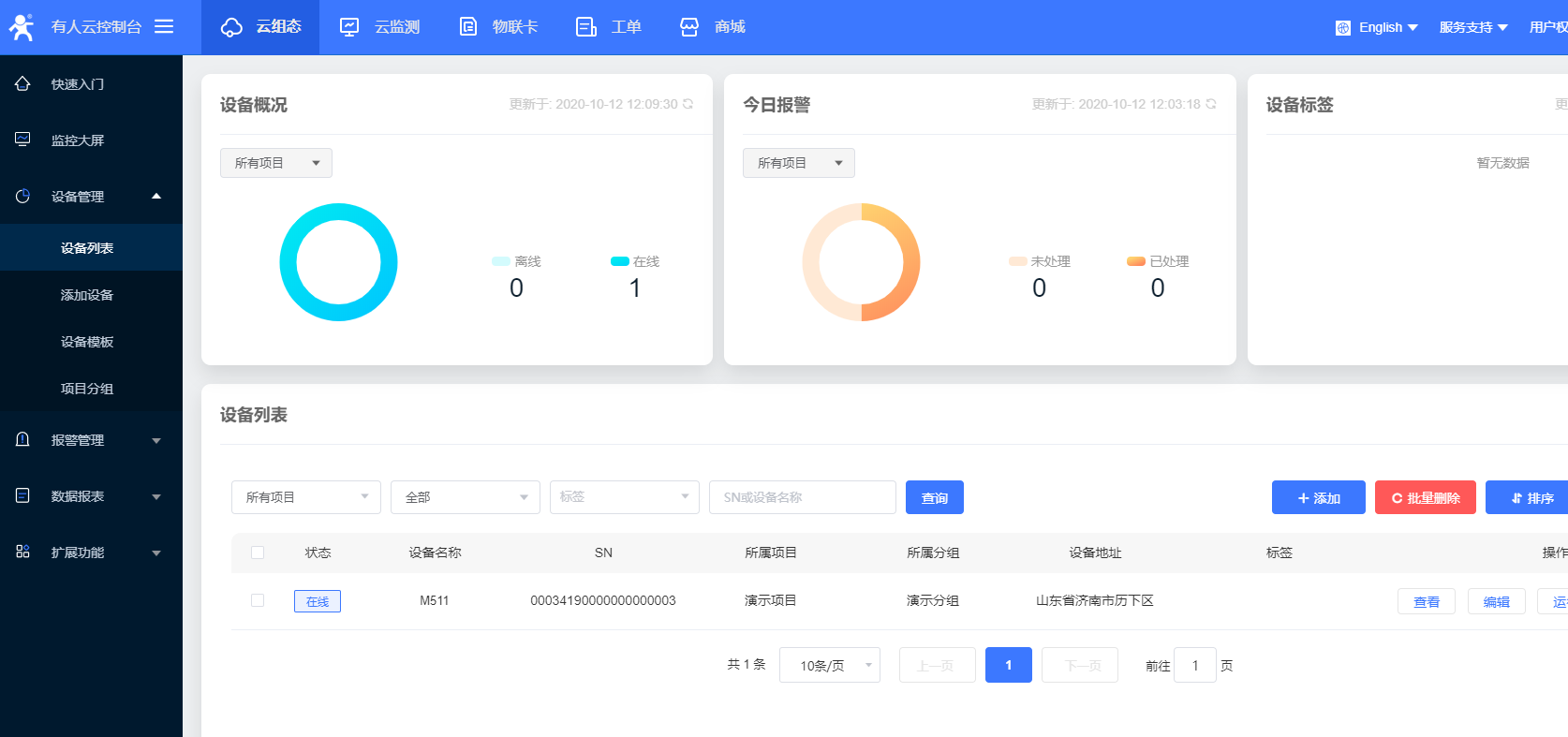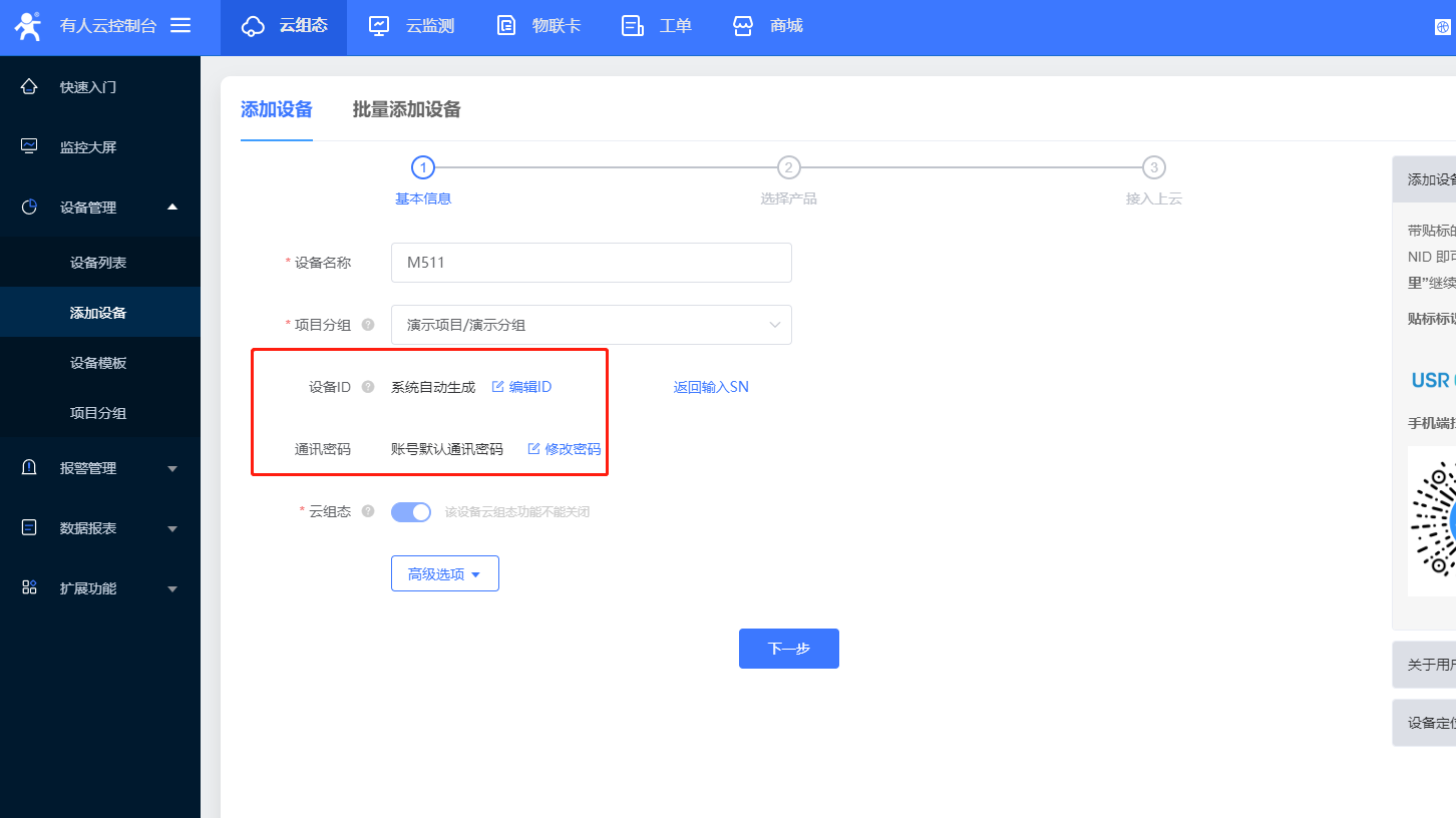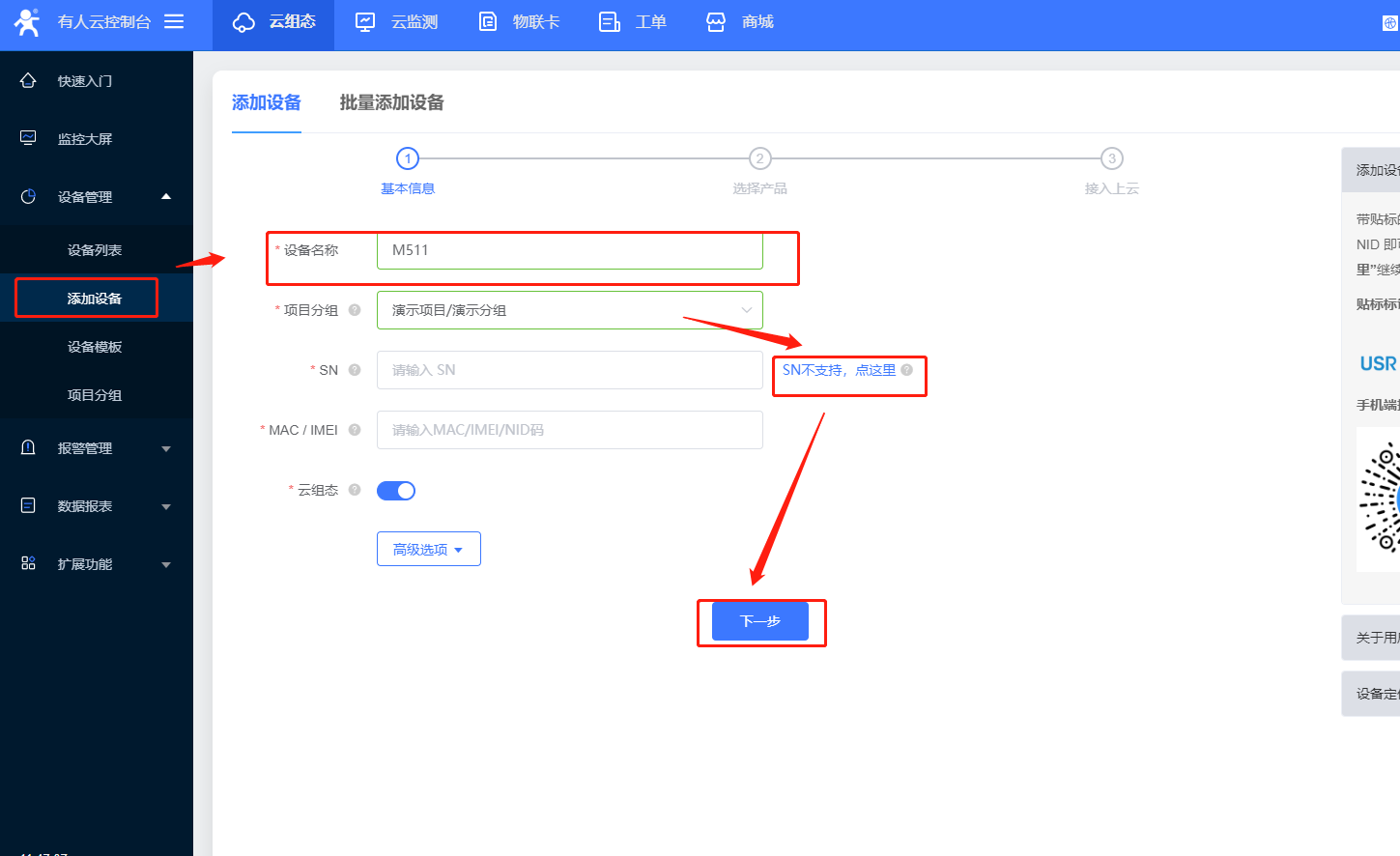 (2)M511不支持SN添加,點擊右側沒有SN,默認自動生成設備編號和通信密碼