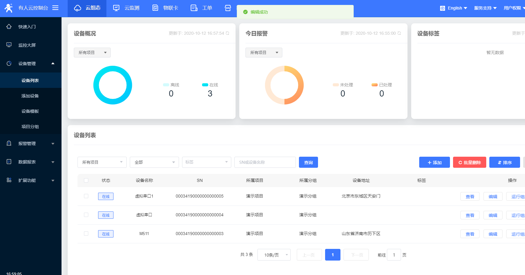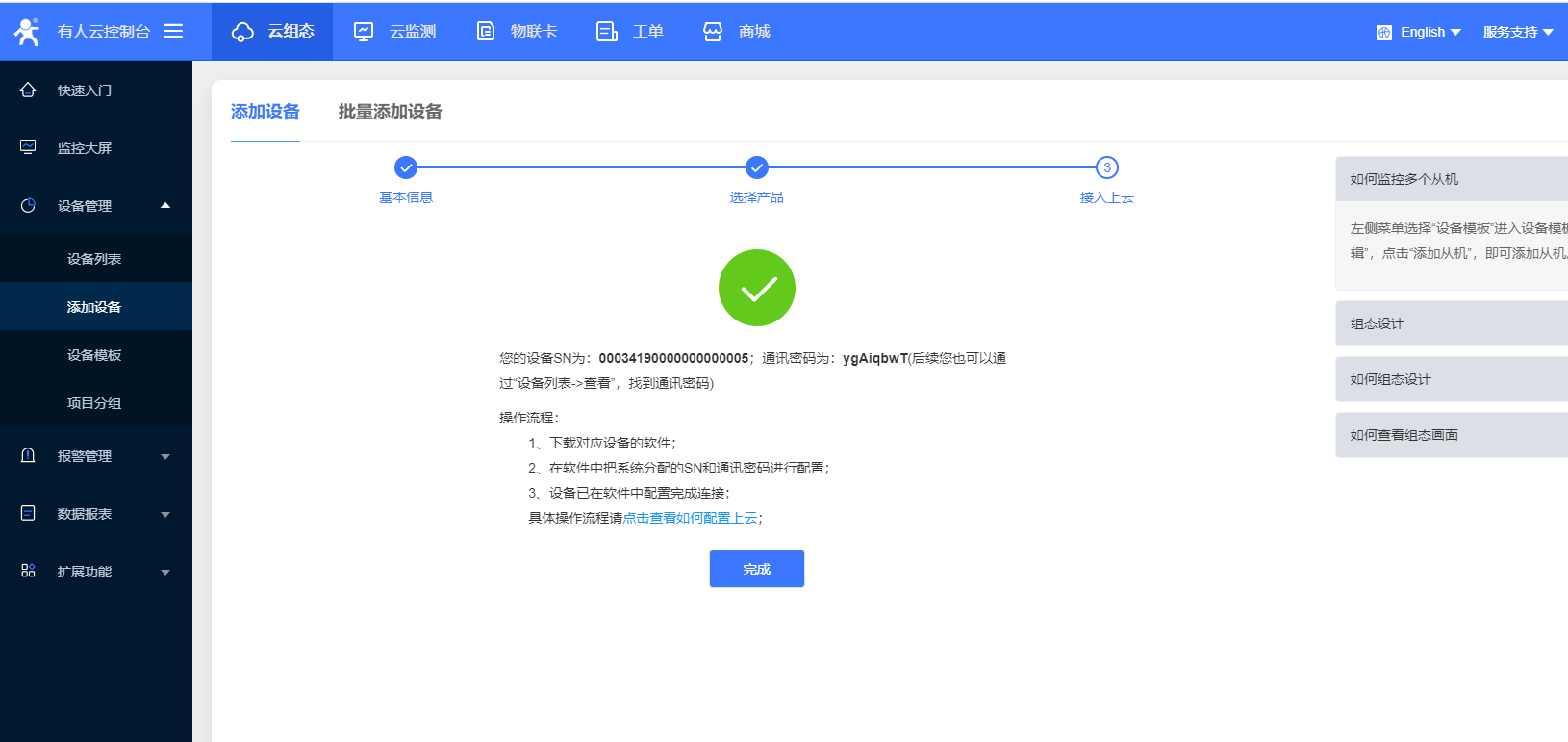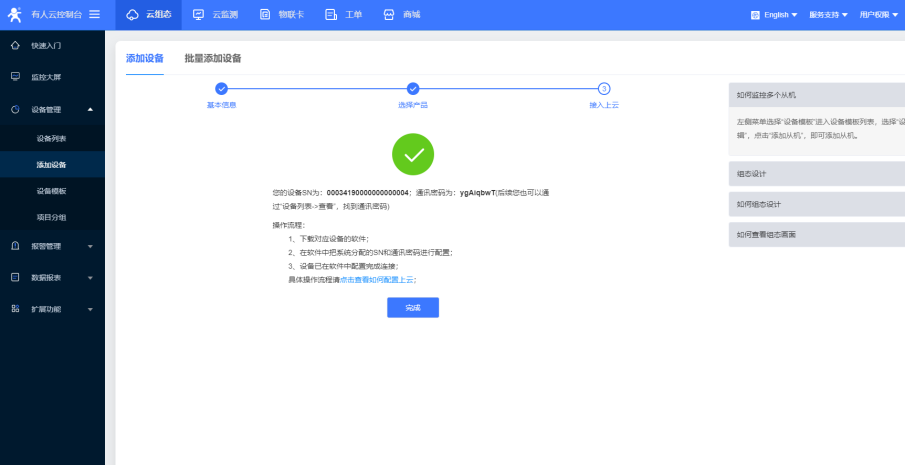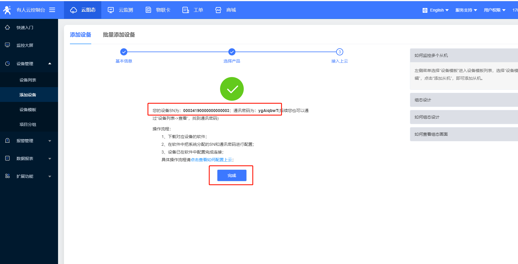 5.可以在這里看到默認生成的設備編號和通信密碼,點擊完成,云端成功添加設備