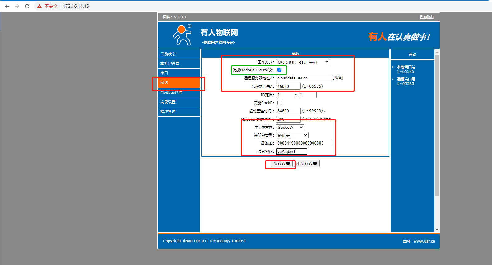 7. 設置串口的參數,工作方式選擇MODBUS RTU主機,遠程服務器地址:clouddata.usr.cn,遠程端口:15000。一定要勾選MODBUS OVER協議。