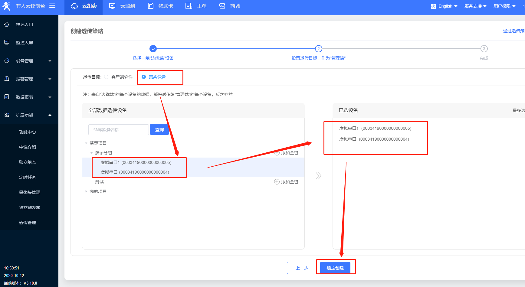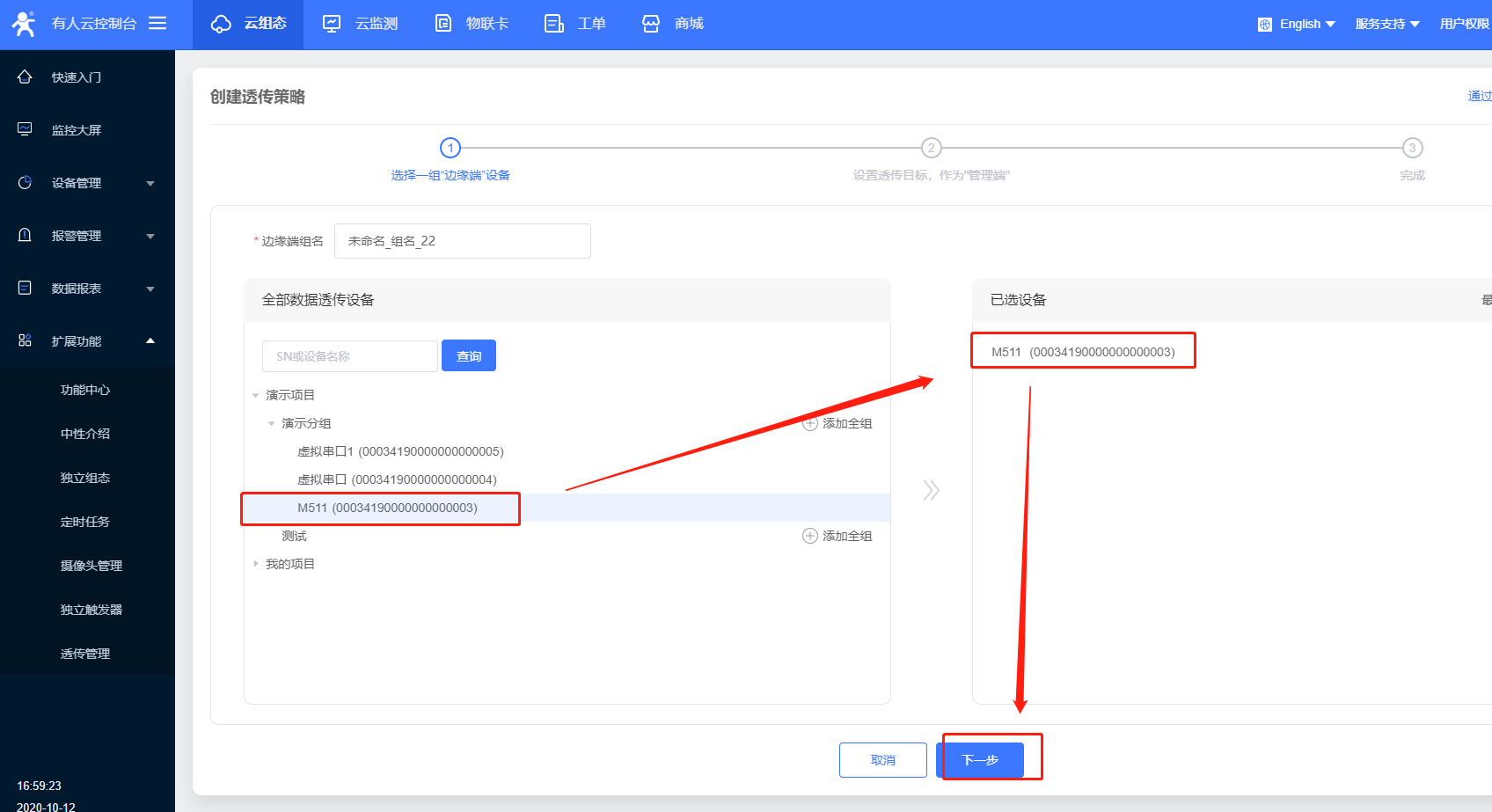 8.透傳策略自定義命名,先選擇透傳組一側的設備,選中,可看到右端出現選中的設備,點擊下一步