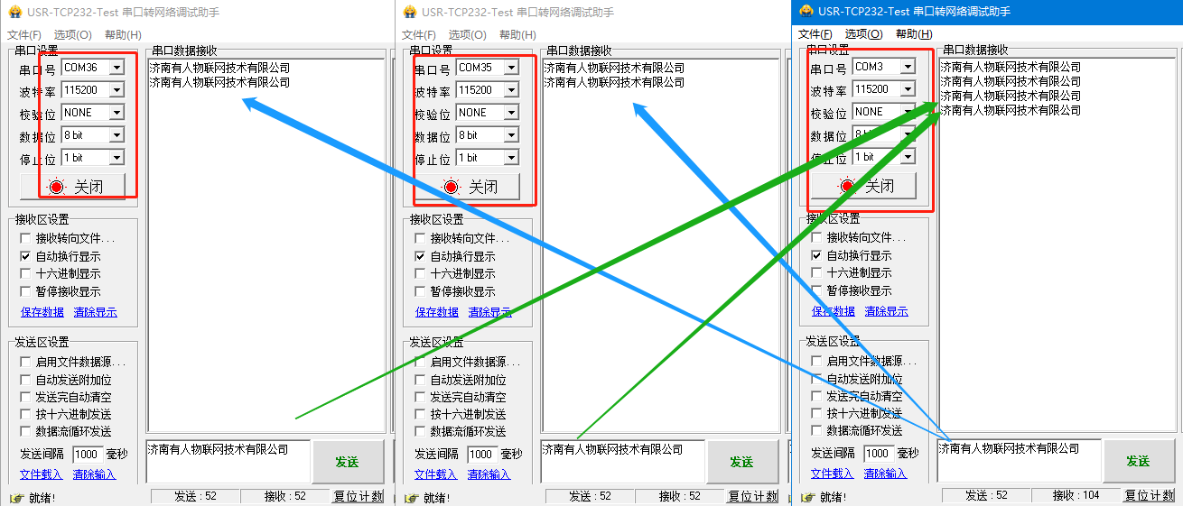 11.用串口調試助手打開虛擬串口生成的串口和M511的串口(三個串口參數必須相同),進行數據互發