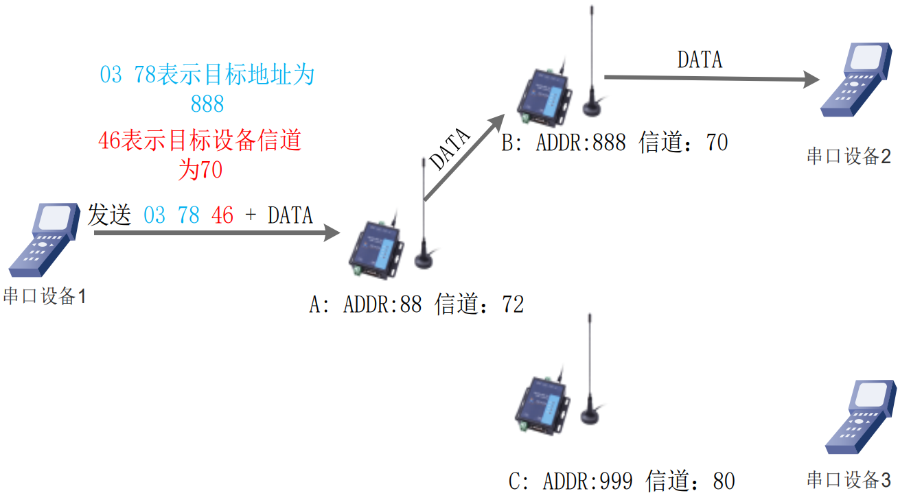 LoRa 數傳終端 A(目標地址(ADDR):88,信道(CH):72)想向另一臺 LoRa 數傳終端 B(目標地址 (ADDR):888,信道(CH):70)發送數據 DATA(123456),則只需要按照 16 進制發送(03 78 46 31 32 33 34 35 36),則 LoRa 數傳終端 B 接收到數據(31 32 33 34 35 36)。