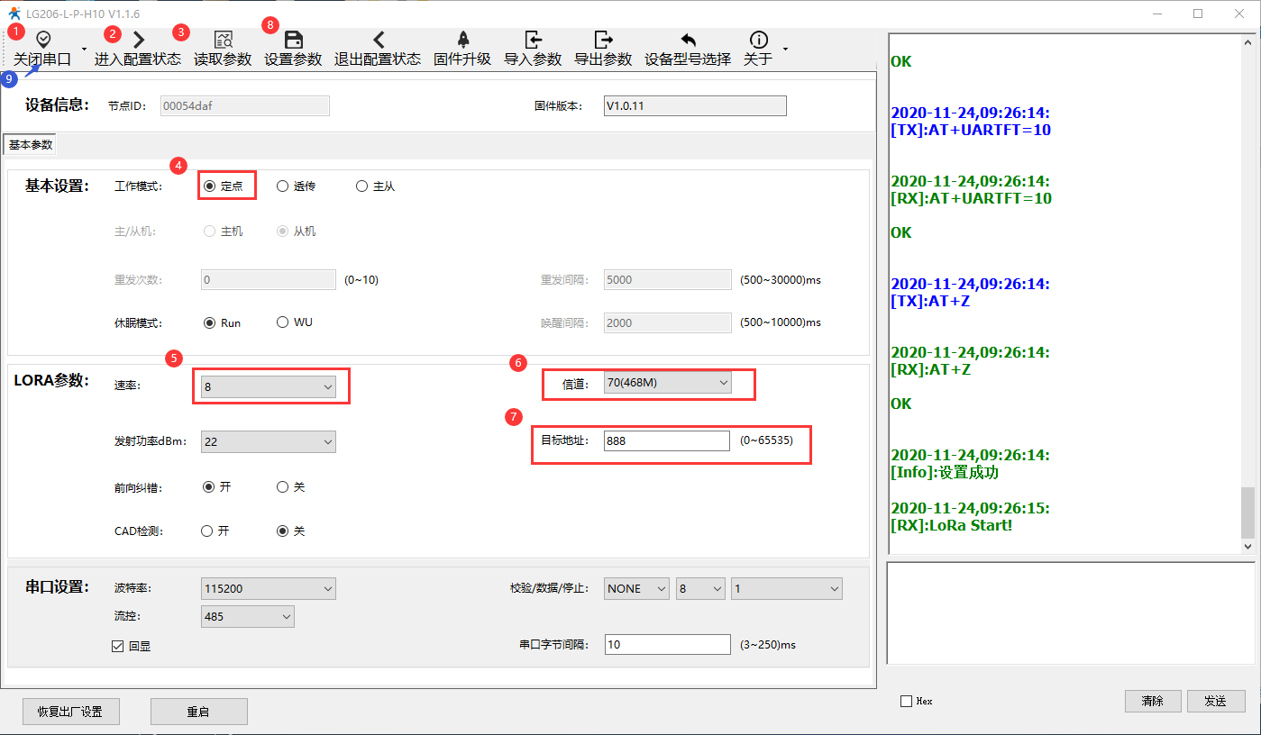 打開LoRa設置軟件→ 選擇LG206-L-P-H10 → 依次點擊打開串口(選擇A、B對應的串口號,串口參數:115200,None,8,1,NFC) → 進入配置狀態 → 讀取參數 → 配置圖中的參數 → 一鍵設置所有參數 → 關閉LoRa設置軟件。