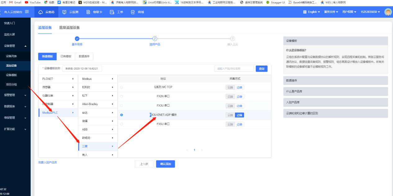 2.添加設備模板,選擇modbus/PLC》三菱》FX3U-ENET-ADP 模塊
