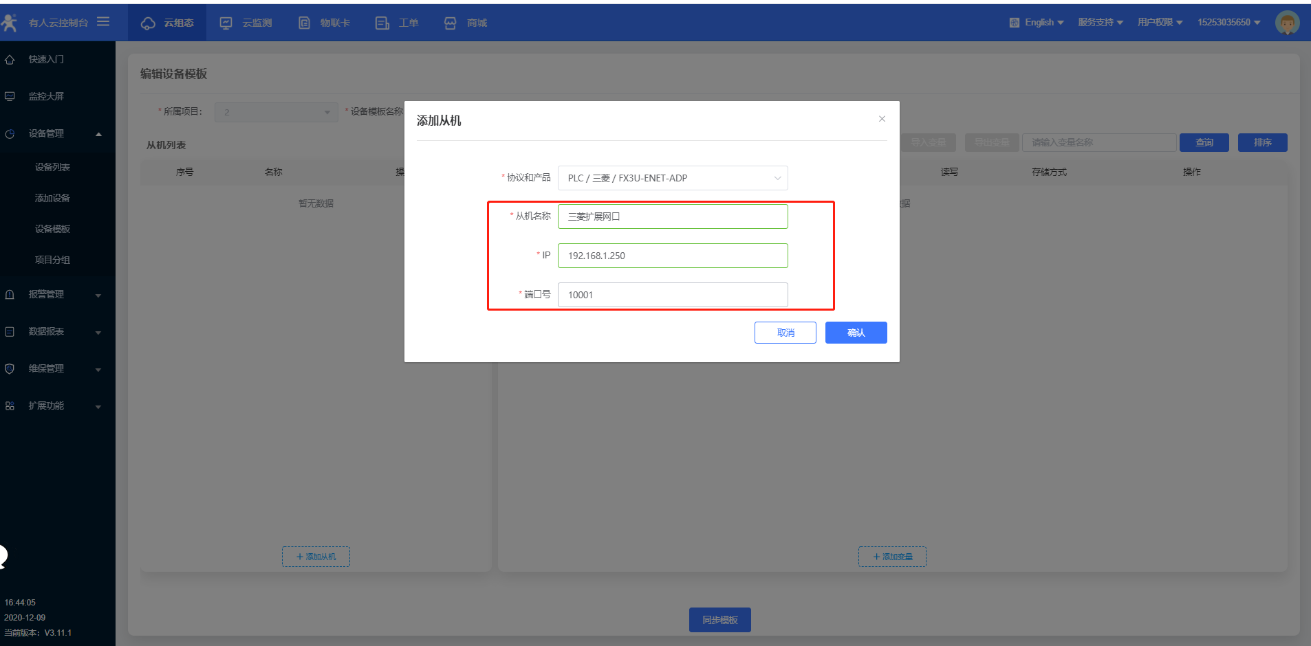 3.下一步填寫從機和變量,從機IP為三菱PLC的IP,端口為三菱PLC的端口