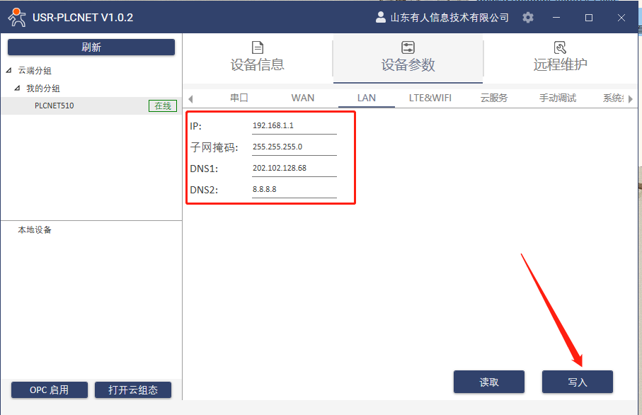 7.設備參數LAN口IP和PLC的IP在同一個網段