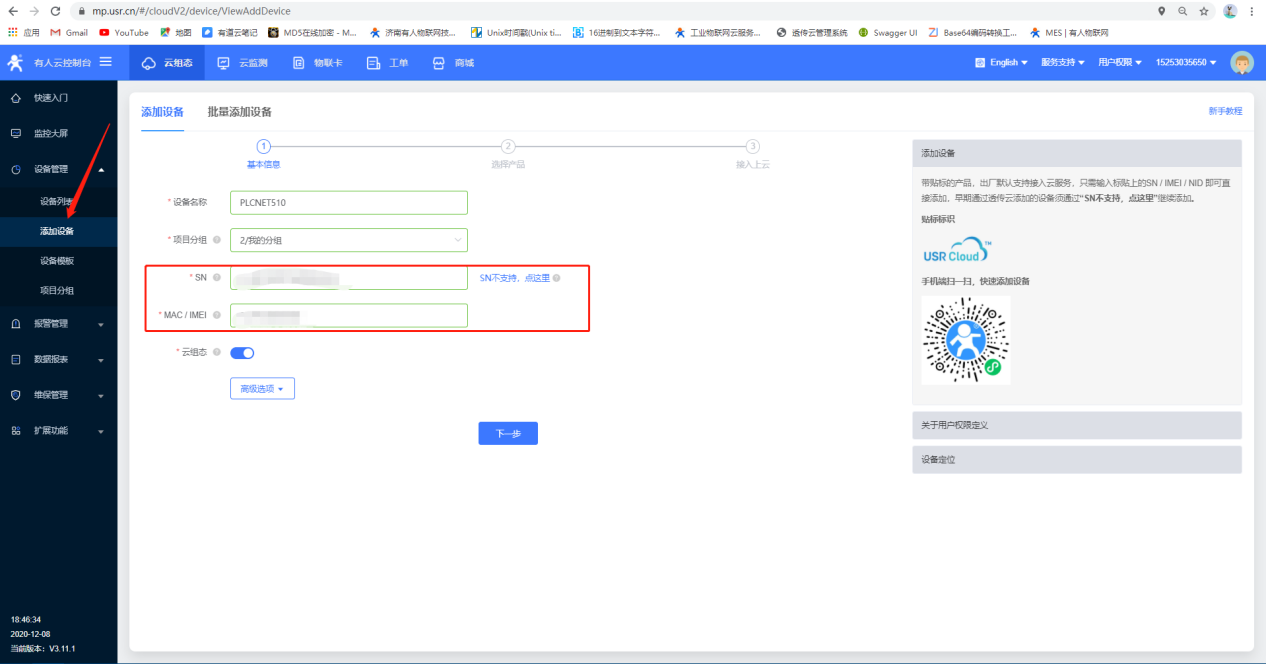 1.登錄有人云賬號和密碼,點擊添加設備,輸入PLCNET510的SN和MAC,點擊下一步