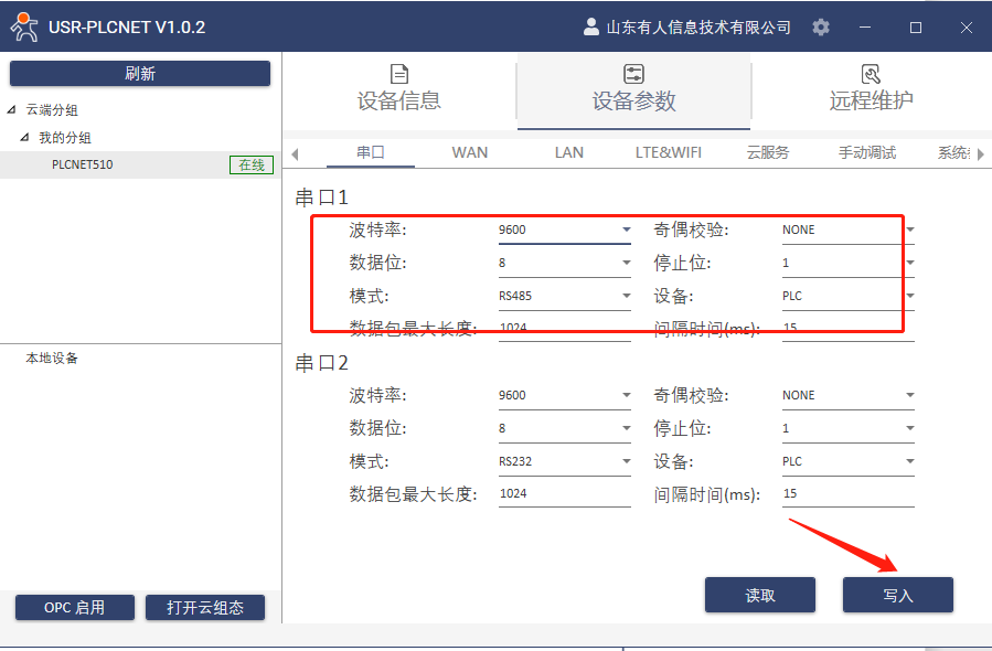 7.設備參數》串口》修改串口波特率和串口設備一致,點擊寫入
