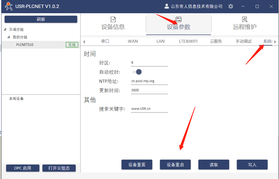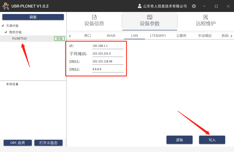10.選中在線設備,設備參數》LAN,修改LAN口IP和PLC的網口IP在同一網段,點擊寫入