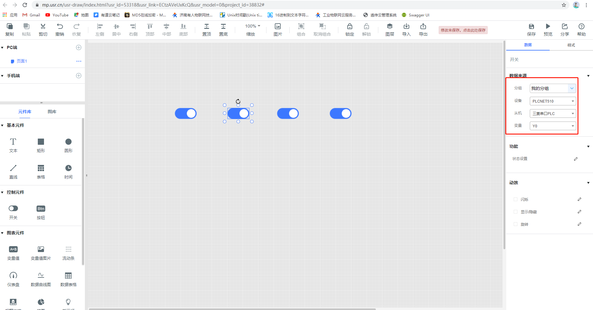 4.添加控件,一個組態畫面添加多個控件,可以同時關聯多個設備下的多個數據點,注意:獨立組態不支持監控大屏顯示