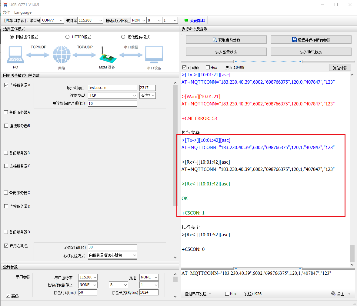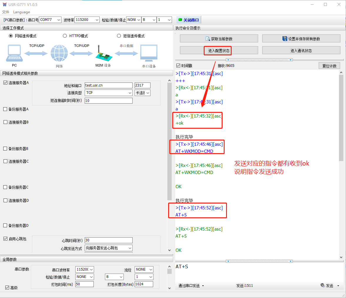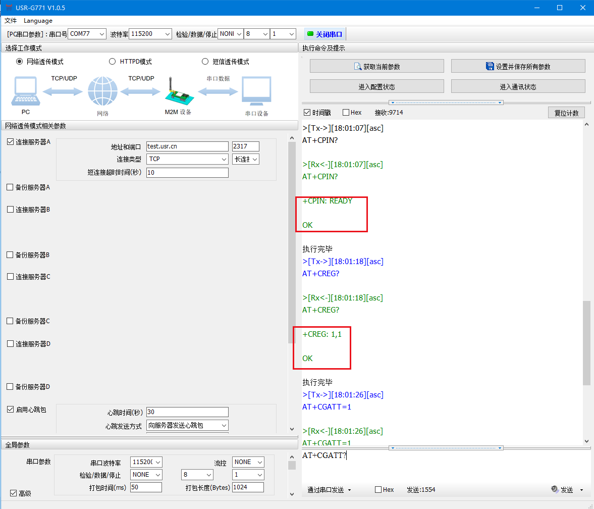 注意:G771工作在CMD模式下,不自動駐網,需要手動駐網,參考下面流程