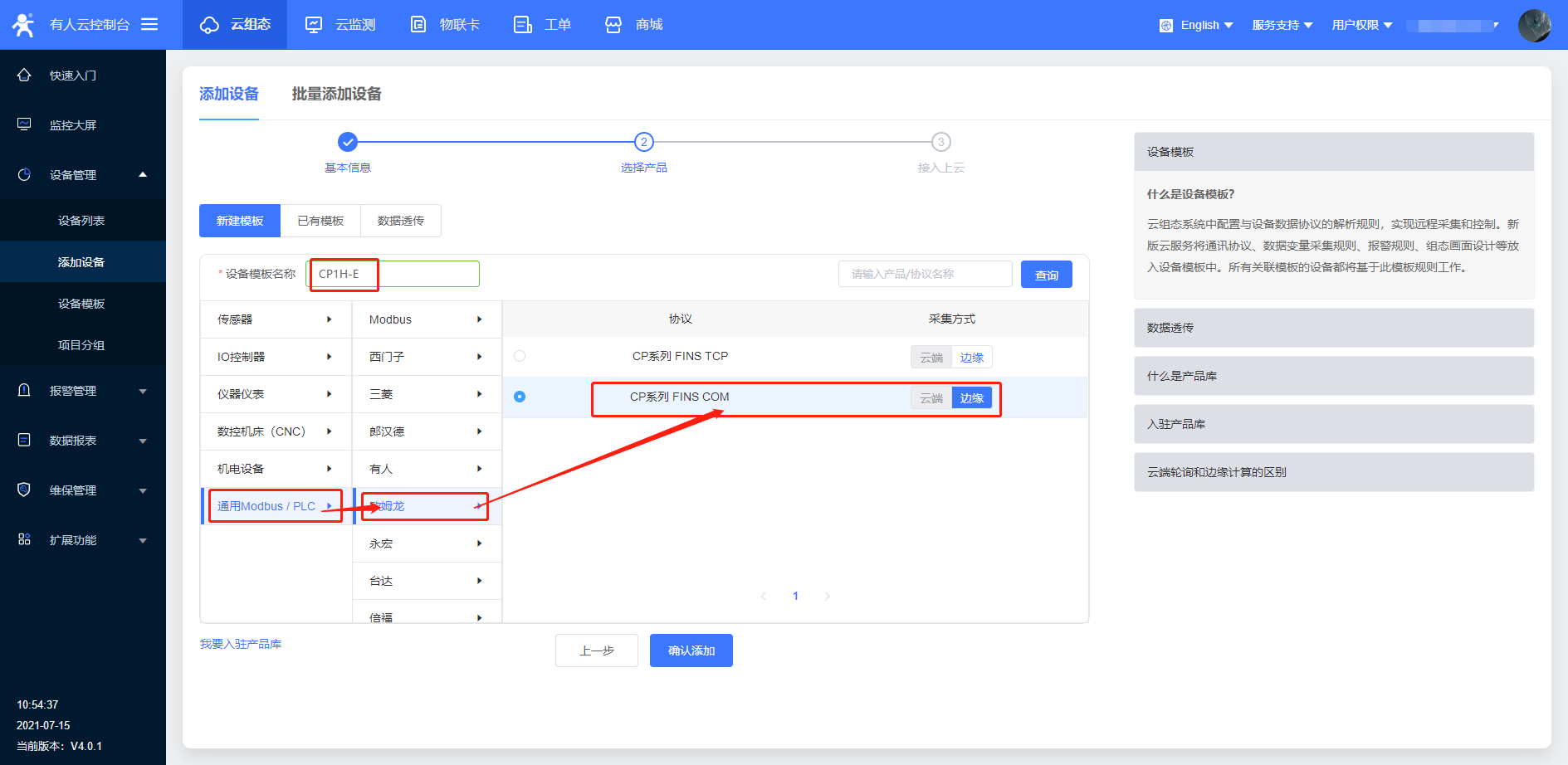 ? 新建模板添加協議并點擊“同步模板”(添加CP系列FINS COM模板后,剩下從機和變量等內容任意即可,開啟透傳后,模板后會失效)