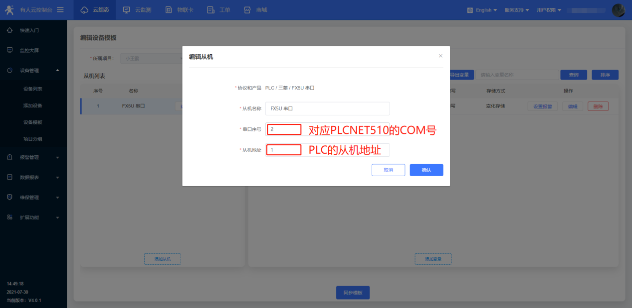 ? 添加從機和變量(請注意串口序號的對應,從機地址是PLC內部屬性),此處添加了一個Y寄存器;添加完成后點擊同步模板。