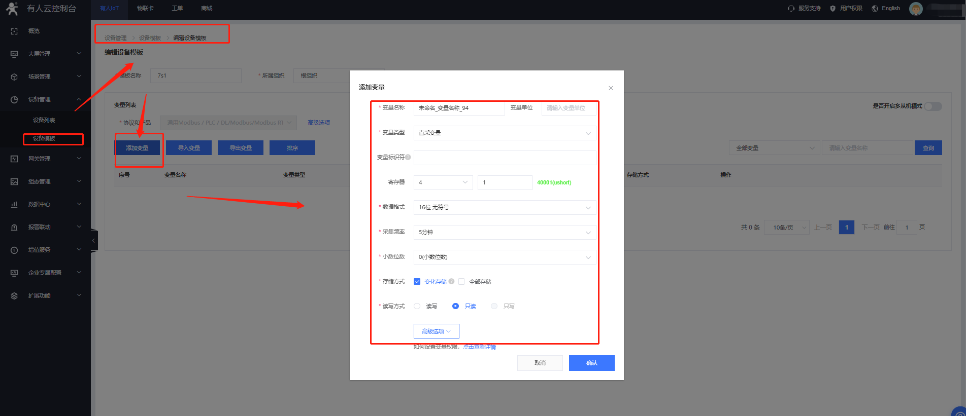 3、添加從機設備,關聯變量模板,7s1 支持modbus協議 云端輪詢方式。