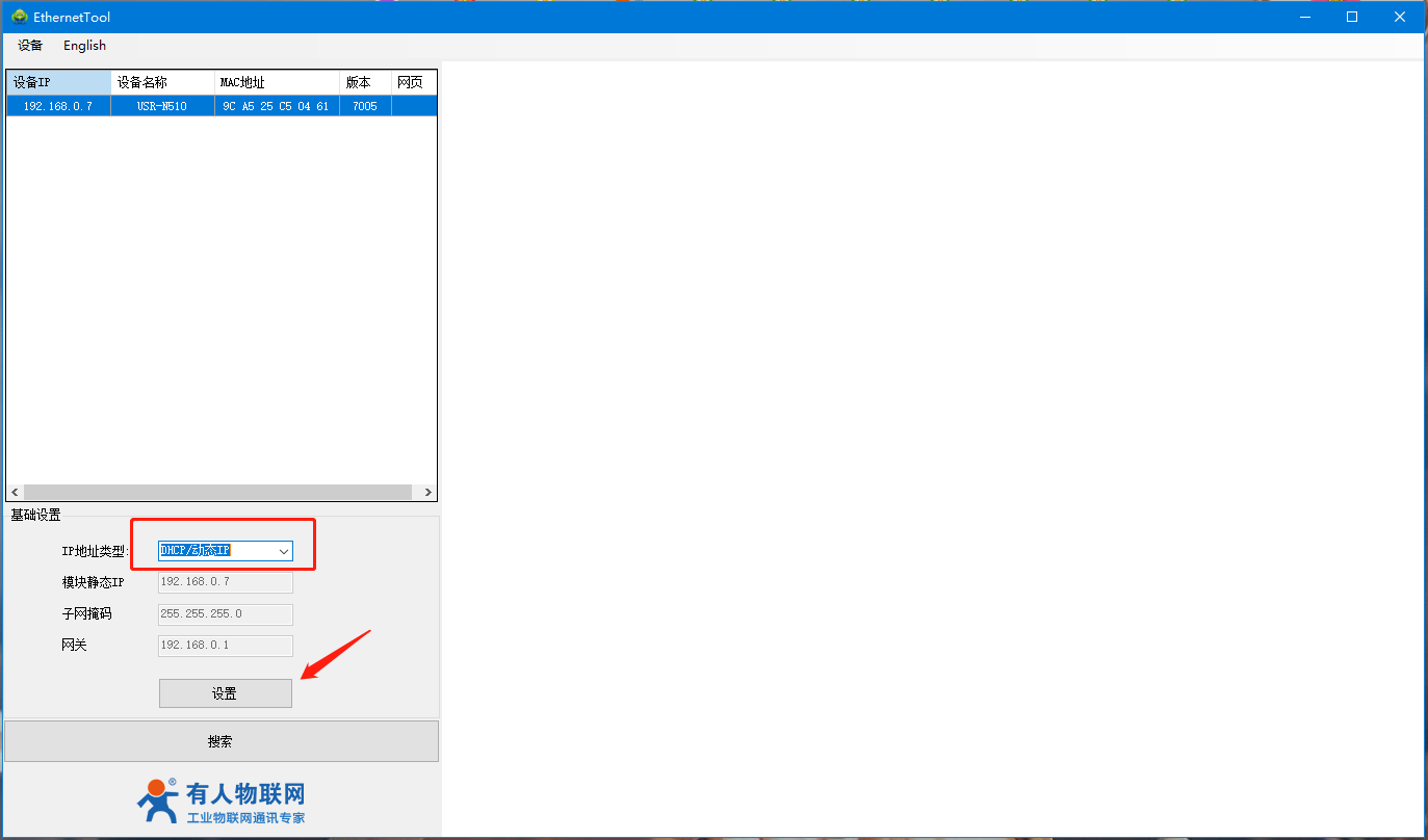 1)、設置軟件,點擊搜索設備點擊搜索到的設備,基礎設置部分,將510的IP地址類型修改為DHCP/動態獲取,然后點擊下方的設置。