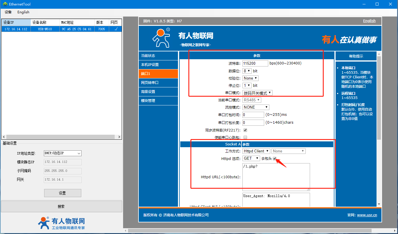 7、在端口1處,確認當前串口參數(默認為115288,N,8,1)以及串口模式(網頁設置優先級大于撥碼開關),默認為撥碼開關模式,所以我們需要將設備的撥碼撥到相應位置,設置模塊工作方式:HTTP client,HTTPD選項設置為GET,點擊去包頭,最后我們獲取到的數據將不會存在包頭,URL為:/1.php? 。