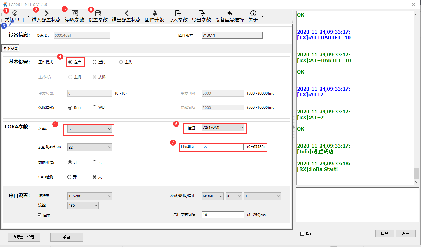 打開LoRa設置軟件→ 選擇LG206-L-P-H10 → 依次點擊打開串口(選擇A、B對應的串口號,串口參數(shù):115200,None,8,1,NFC) → 進入配置狀態(tài) → 讀取參數(shù) → 配置圖中的參數(shù) → 一鍵設置所有參數(shù) → 關(guān)閉LoRa設置軟件。