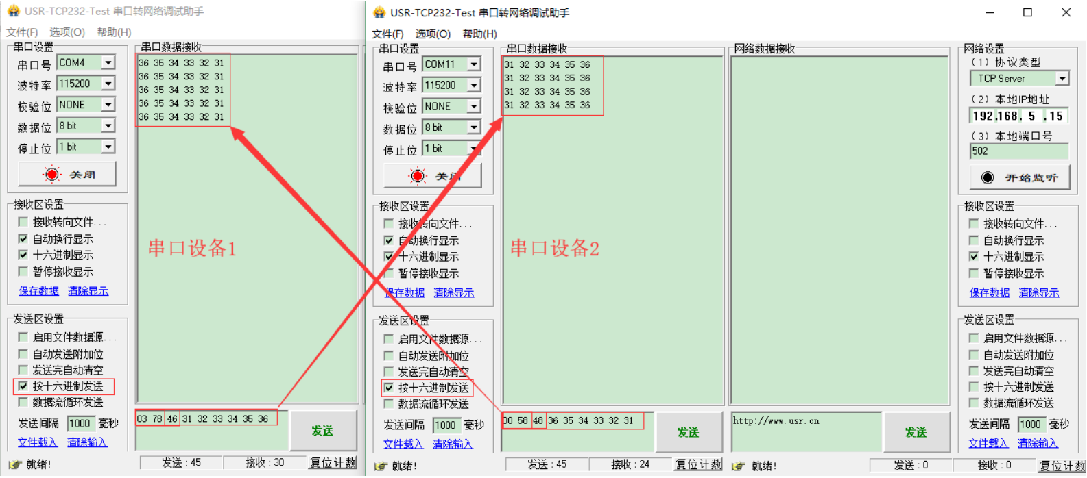啟動兩個USR-TCP232-Test(模擬串口設備1,2)分別連接LoRa數(shù)傳終端A、B的串口,使用串口設備1發(fā)送數(shù)據(jù)串口設備2可接收數(shù)據(jù)(反之亦然)。