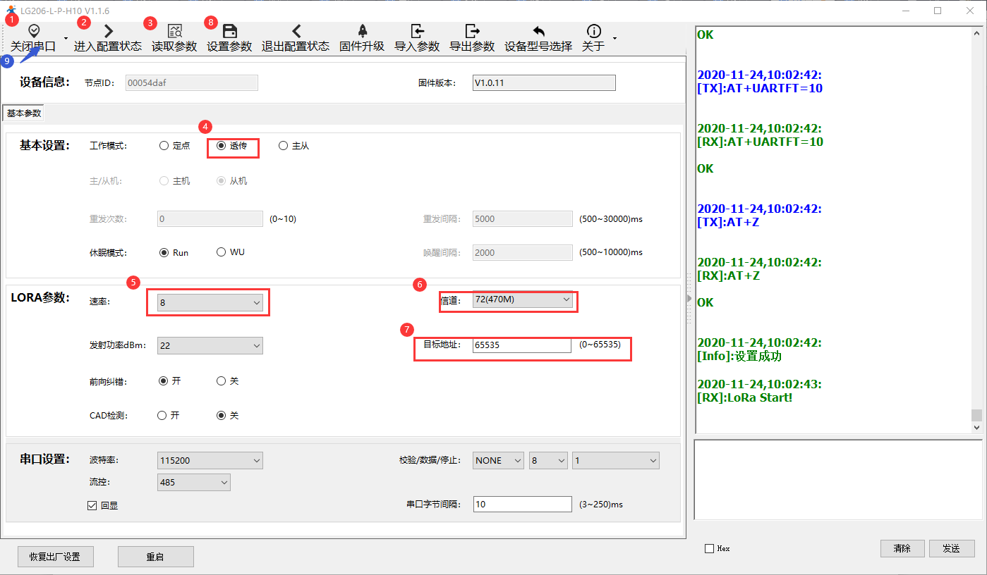 打開LoRa設置軟件→ 選擇LG206-L-P-H10 → 依次點擊打開串口(選擇A、B對應的串口號,串口參數:115200,None,8,1,NFC) → 進入配置狀態 → 讀取參數 → 配置圖中的參數 → 一鍵設置所有參數 → 關閉LoRa設置軟件。