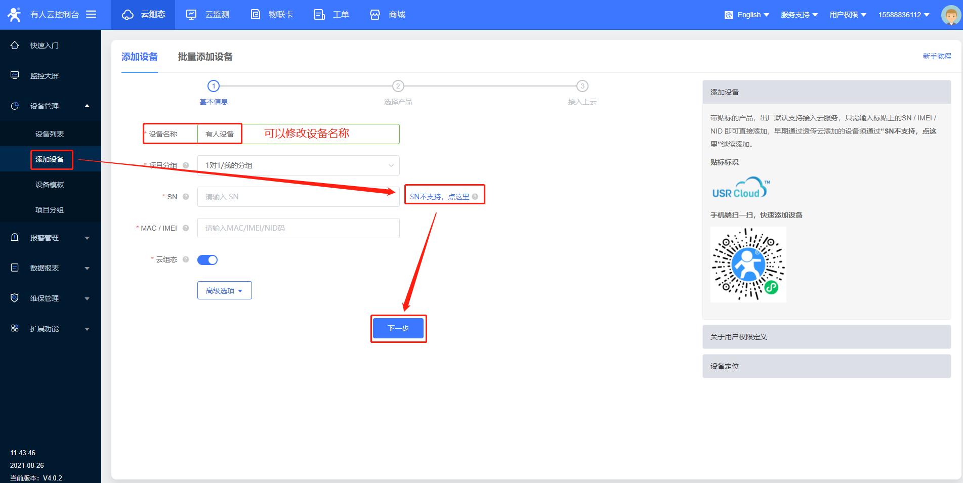 2>云平臺添加設(shè)備,G807選擇“SN不支持,點這里”,用系統(tǒng)自動分配的編號和密碼即可