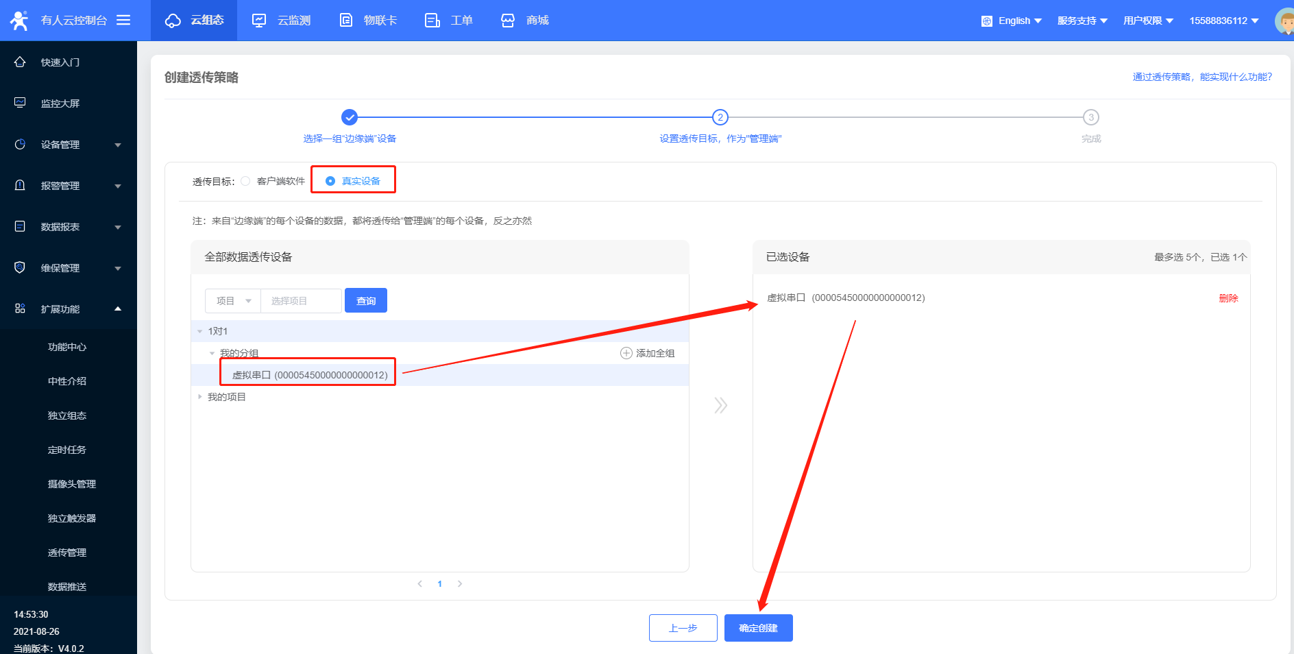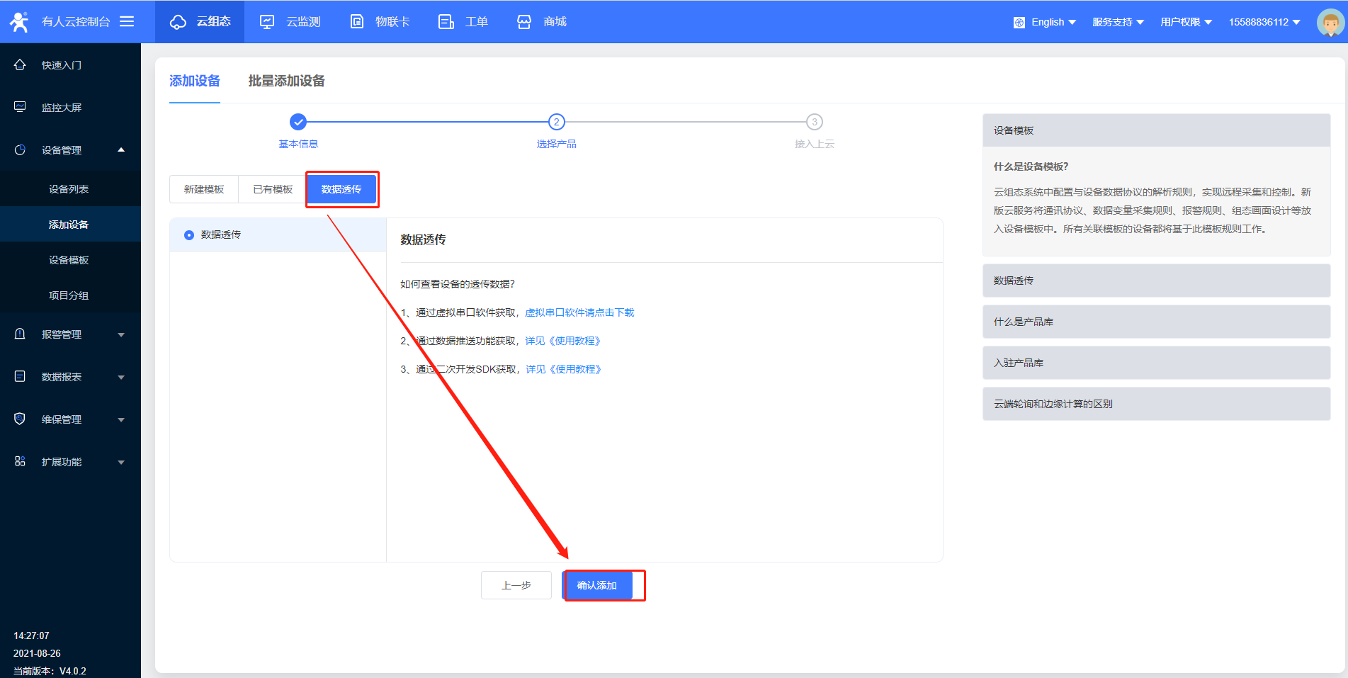 4>按照步驟2的方法再添加一個設(shè)備,用于分配給虛擬串口(注意:需要在云平臺添加2個設(shè)備,一個對應(yīng)G807,一個對應(yīng)虛擬串口)