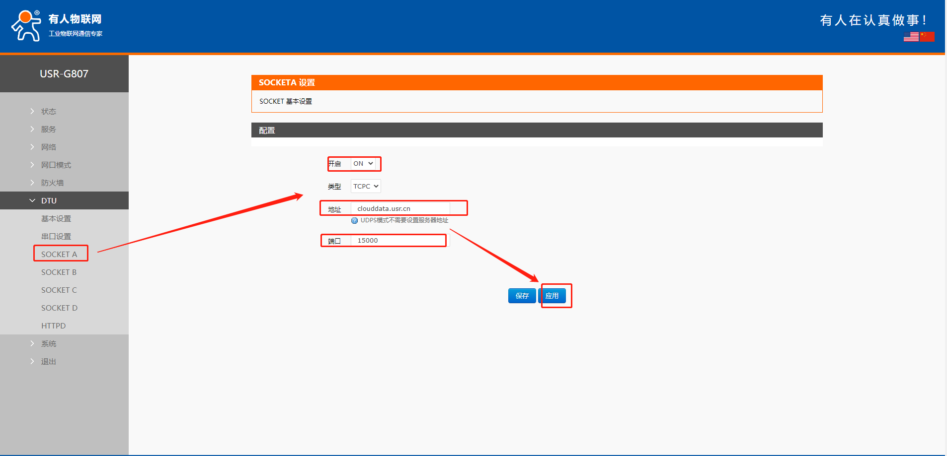開啟SOCKET功能,設(shè)置服務(wù)器的IP地址(clouddata.usr.cn)以及端口號(15000),然后點擊應(yīng)用