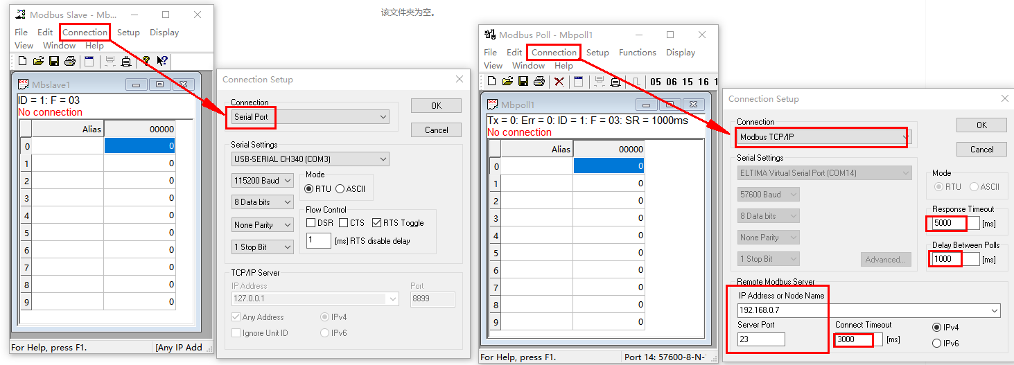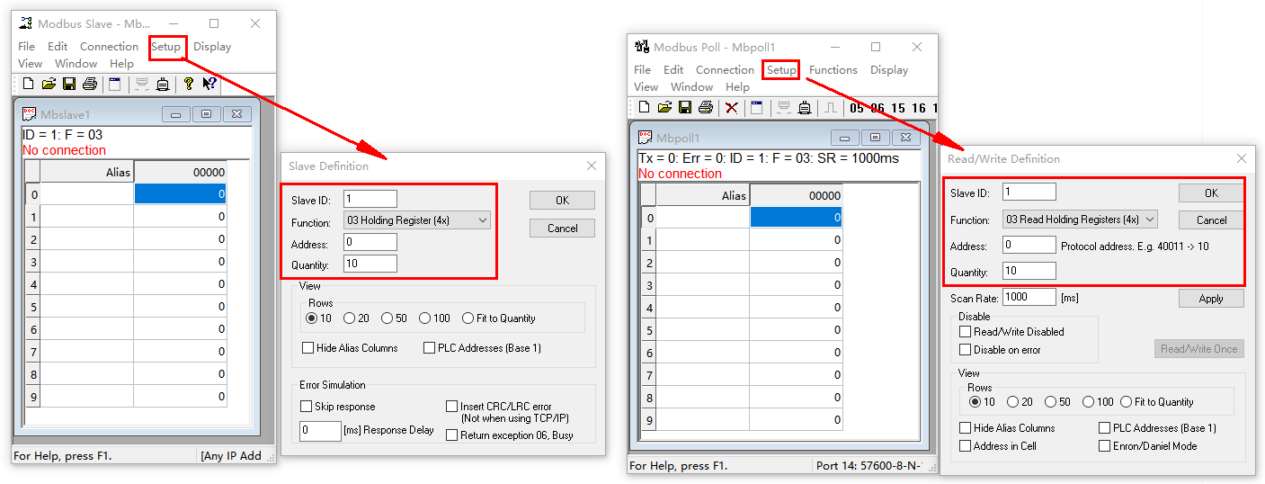 2、MODBUS SLAVE和MODBUS POLL軟件設置: