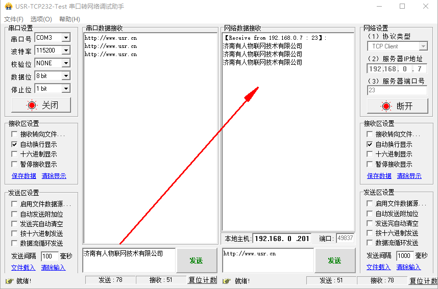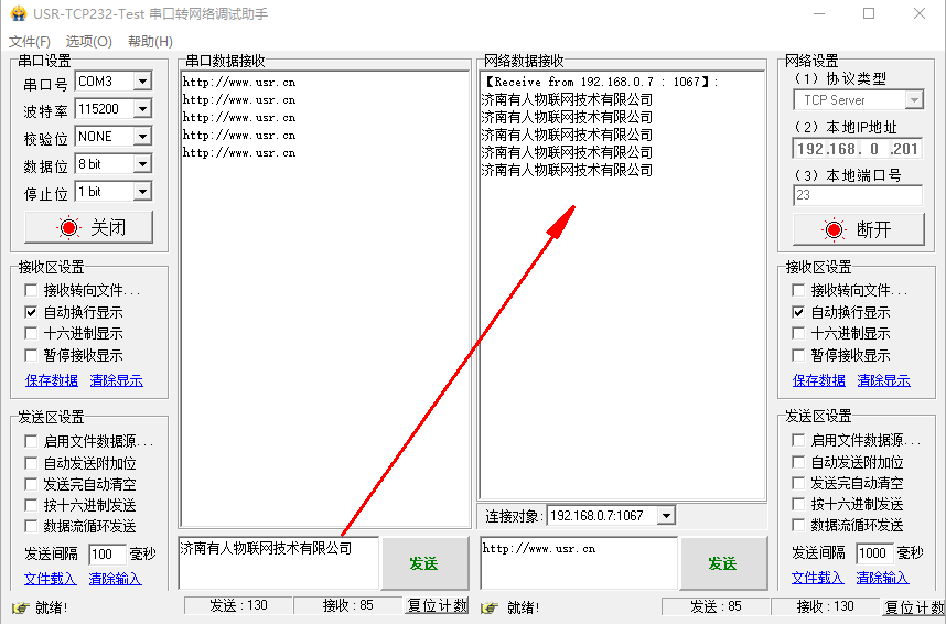 網絡助手點擊連接,有連接對象之后,測試串口和網絡之間的數據傳輸。