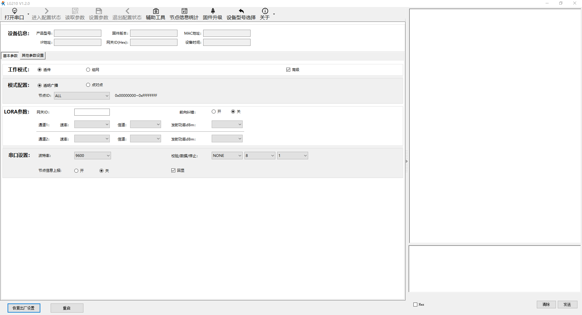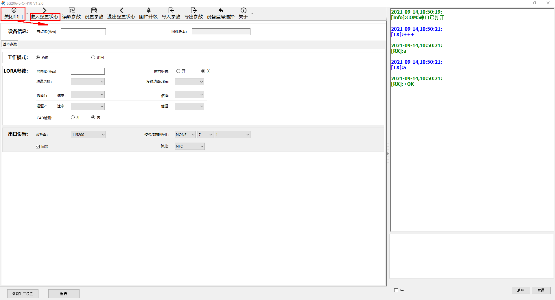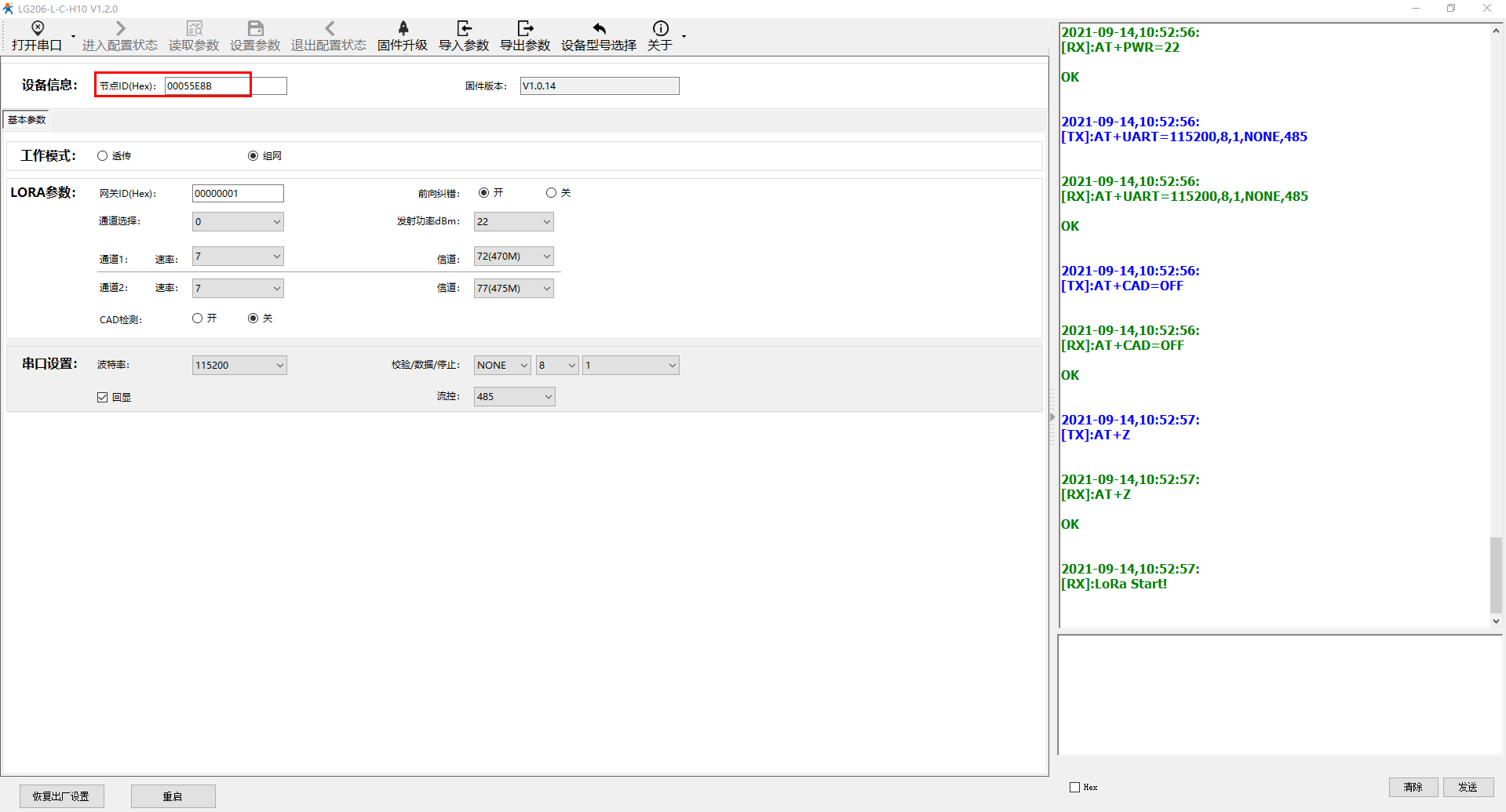 電腦打開USR-LG206-L-C-H10的設置軟件,打開串口,點擊進入配置狀態,讀取參數,然后設置組網模式,通道一和通道二的速率、信道設置和USR-LG210-L的通道一和通道二的速率、信道一致。網關ID設置為00000001,和USR-LG210-L的網關ID一致。