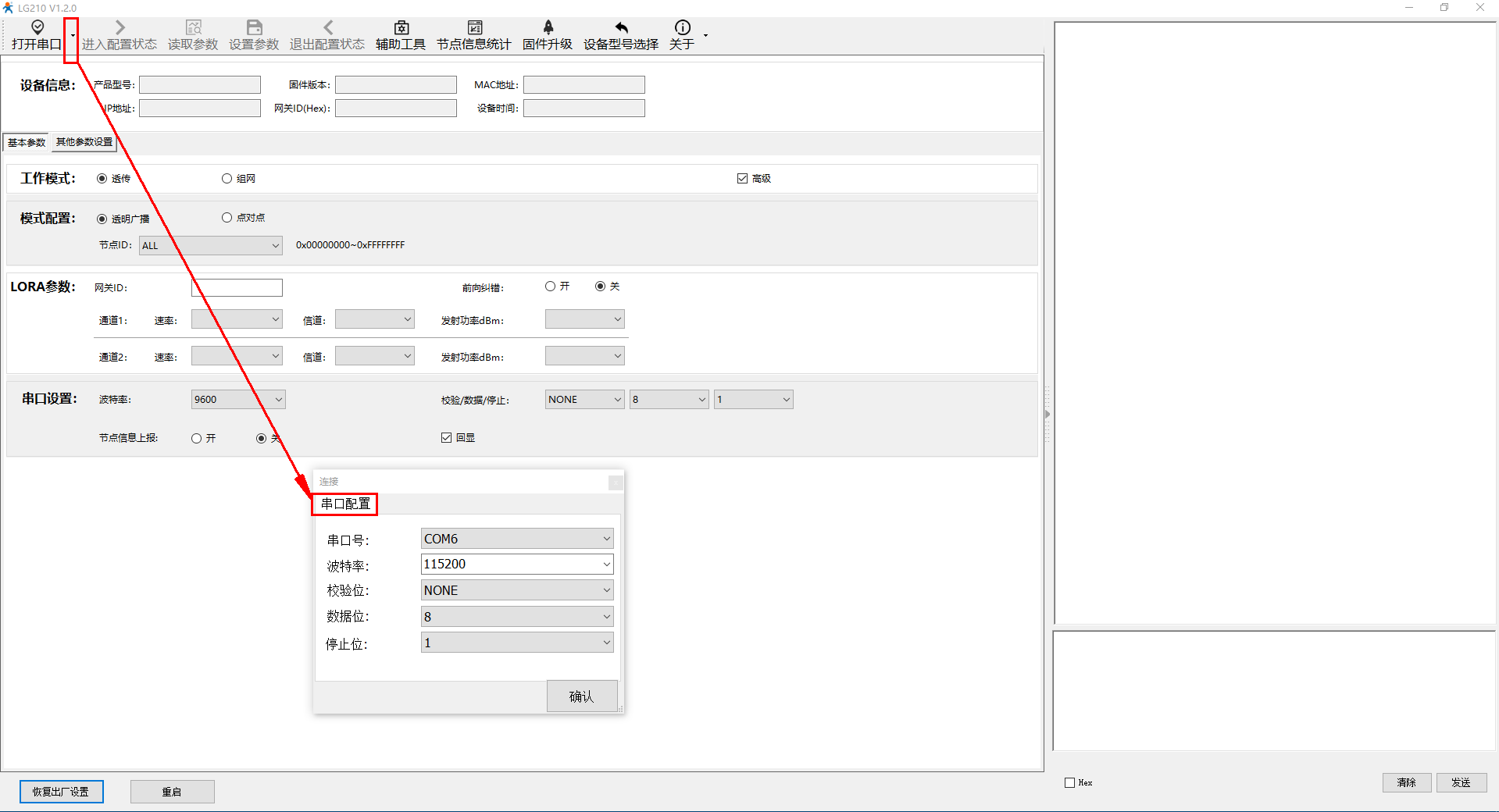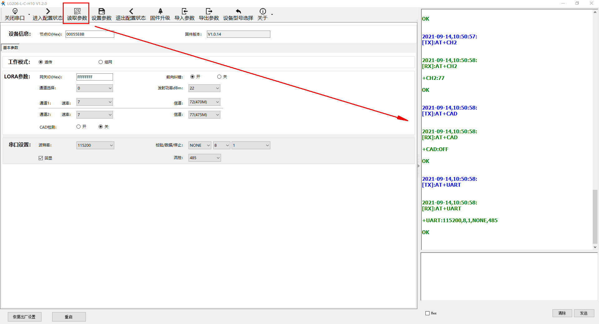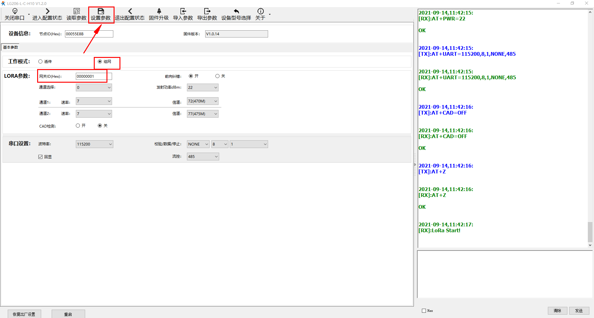 電腦打開USR-LG206-L-C-H10的設置軟件,打開串口,點擊進入配置狀態,讀取參數,然后設置組網模式,通道一和通道二的速率、信道設置和USR-LG210-L的通道一和通道二的速率、信道一致。網關ID設置為00000001,和USR-LG210-L的網關ID一致。