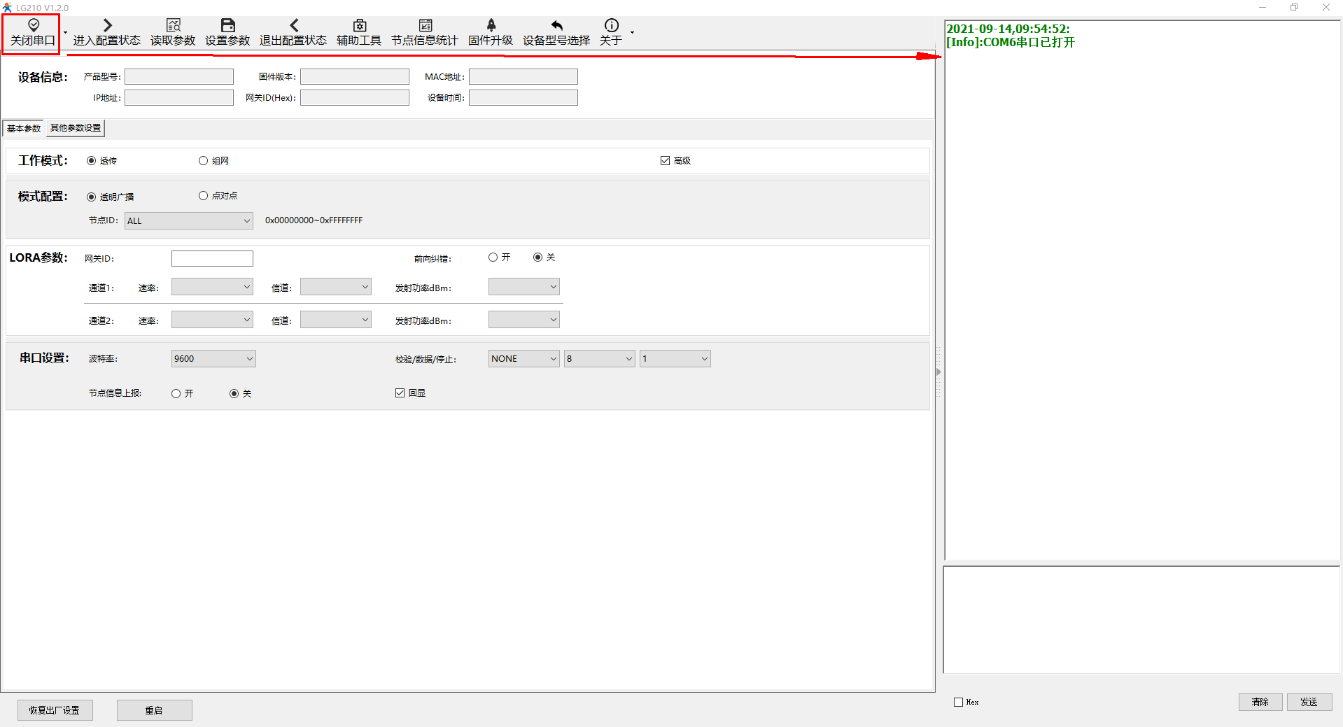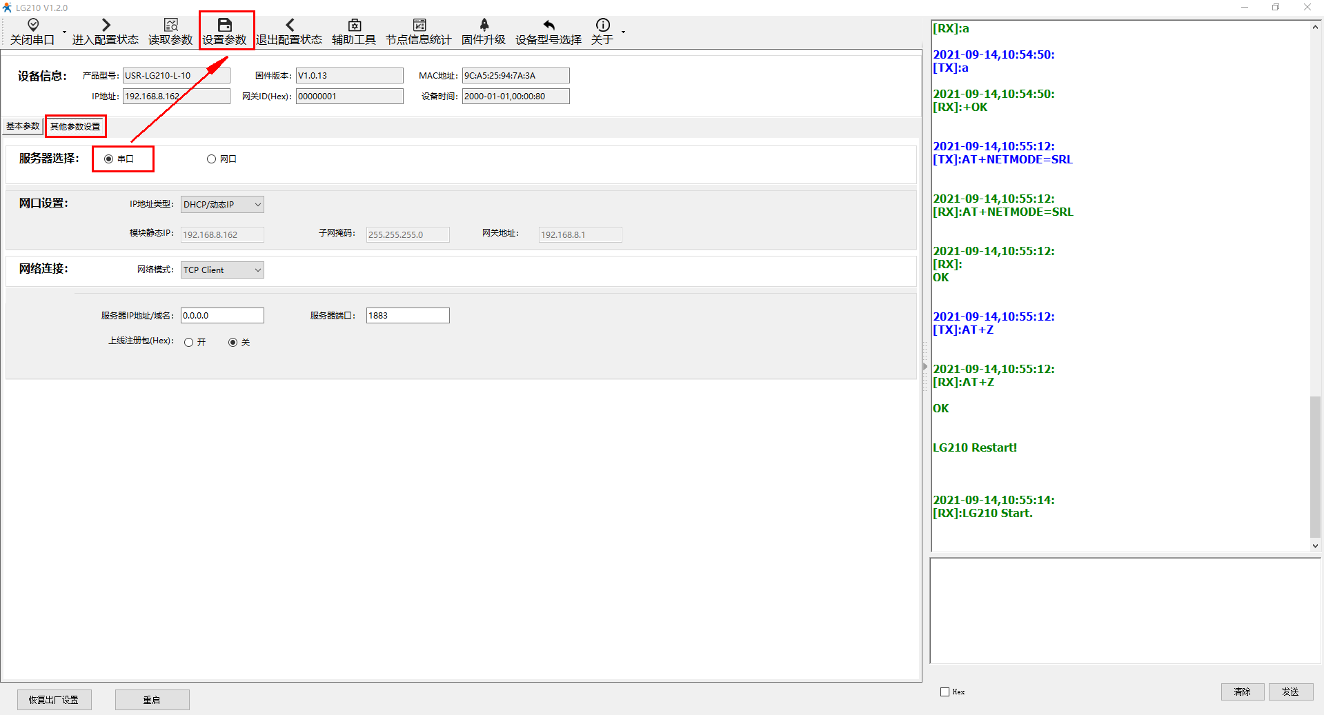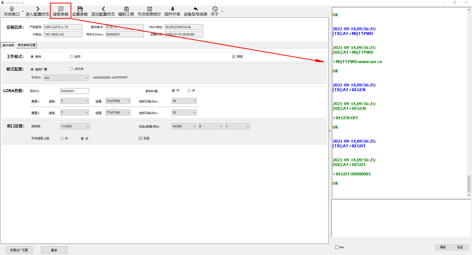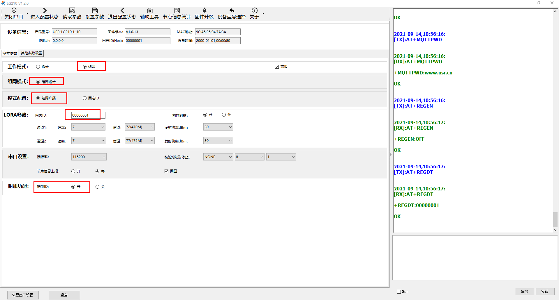 電腦打開USR-LG210-L的設置軟件,打開串口,點擊進入配置狀態,讀取參數,然后設置組網模式,網關ID設置為00000001,開啟攜帶ID功能,其他參數設置選擇串口。設置參數保存重啟。