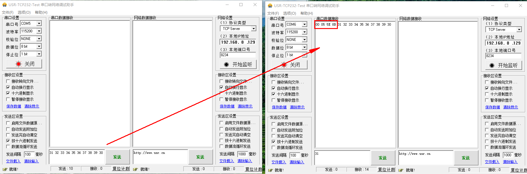 打開2個串口網絡助手,分別選擇USR-LG206-L-C-H10和USR-LG210的USB-RS232串口線COM口號,打開串口,然后USR-LG206-L-C-H10發送數據,USR-LG210-L的串口軟件接收數據。