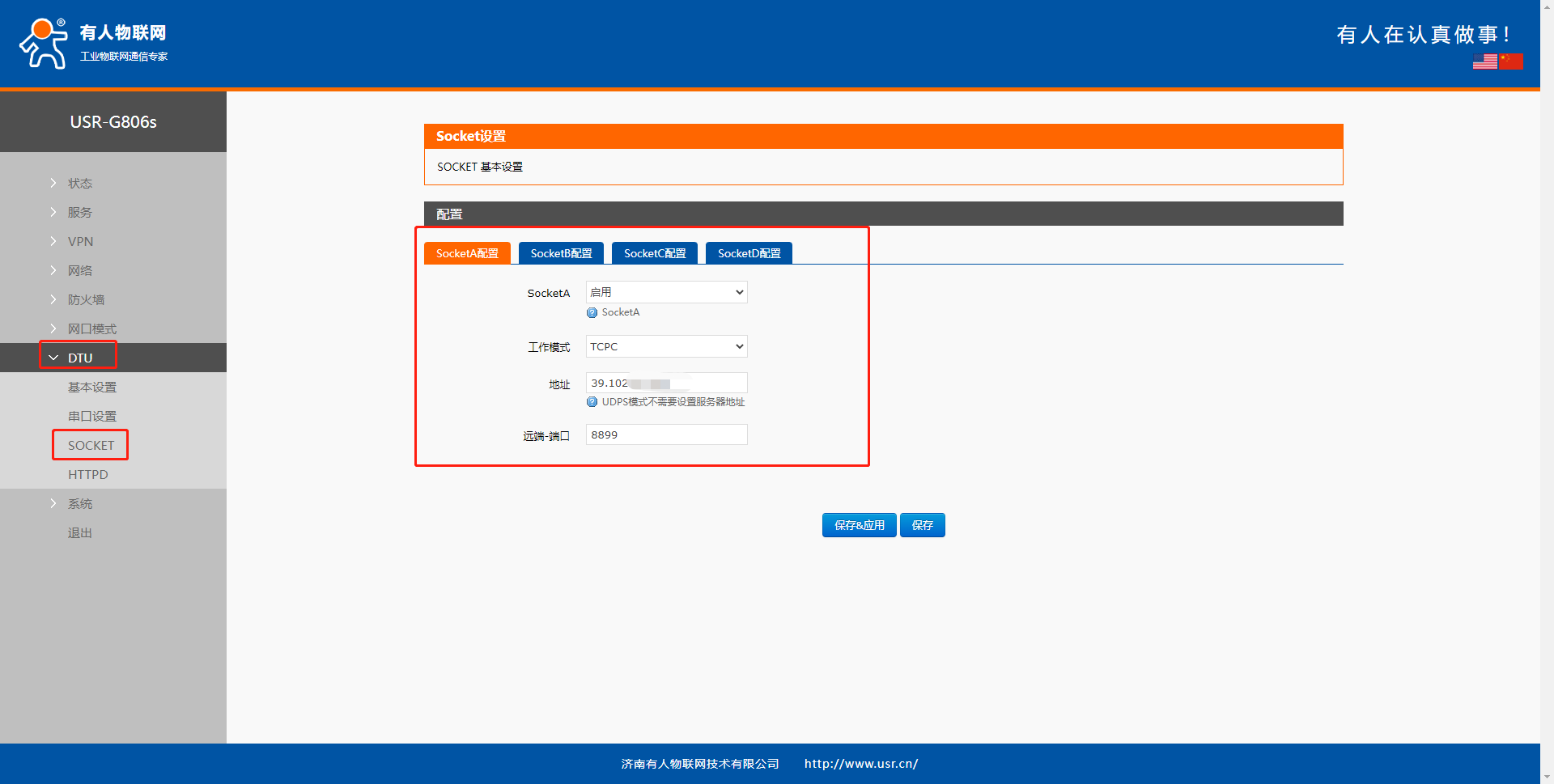 開啟SOCKET功能,設置服務器的IP地址以及端口號,然后點擊應用