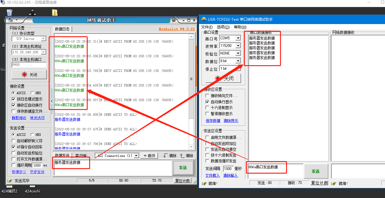6.數據收發測試:等待G806s重啟成功,和服務器建立連接,在電腦端和服務器端分別打開串口網絡二合一調試助手,實現G806s的串口和服務器端的數據通訊。