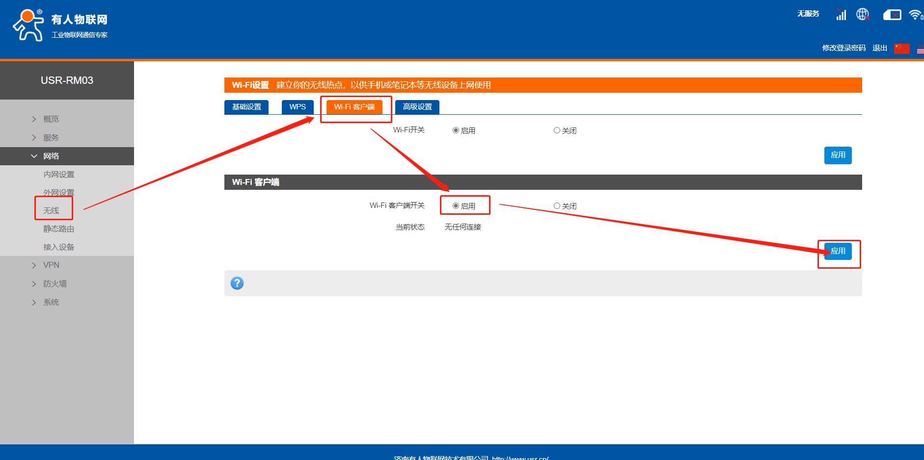 5. 內置網頁 網絡-無線界面,啟用wifi客戶端之后點擊應用