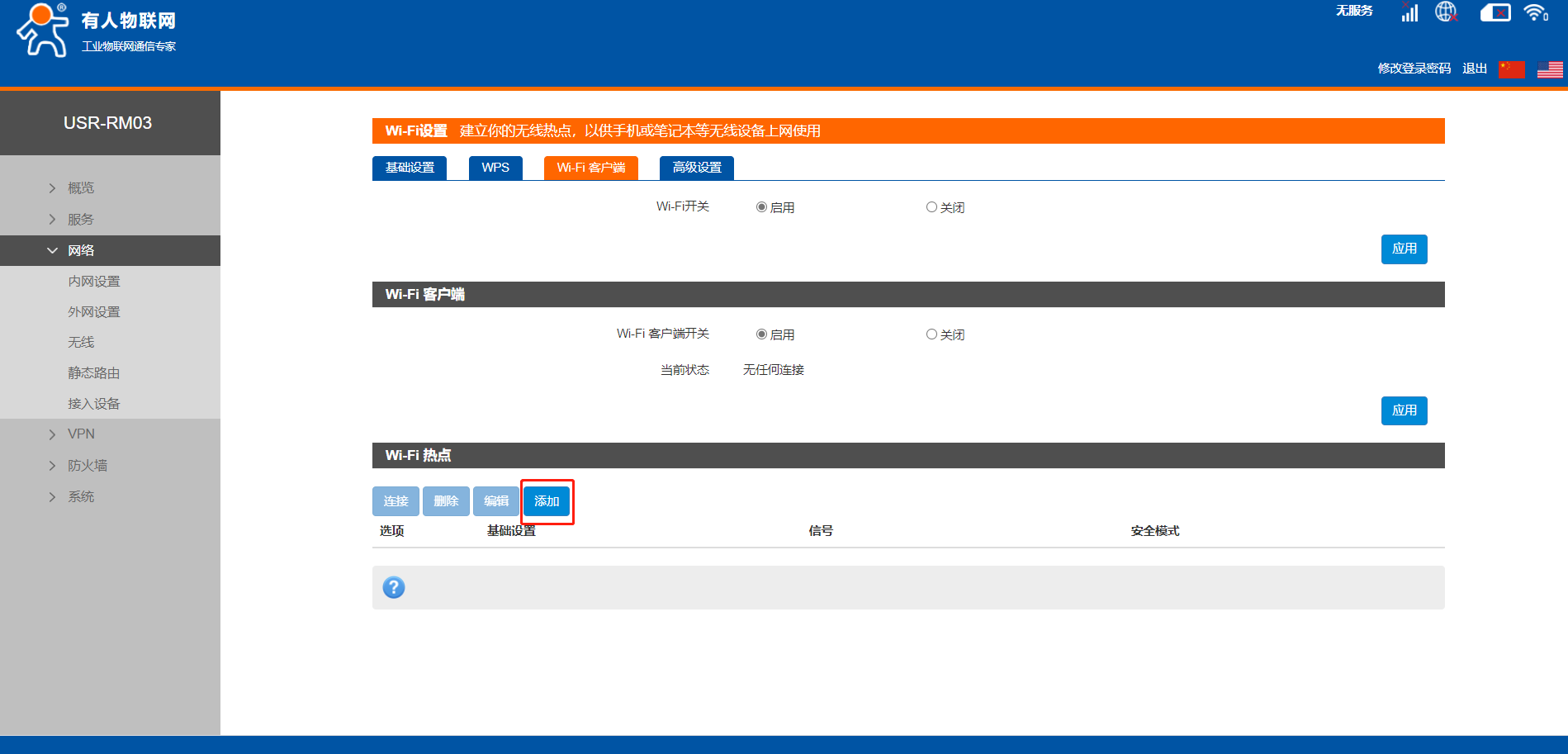 6. 啟用WiFi 客戶端功能后,點擊添加,可以搜索到模塊附近的wifi