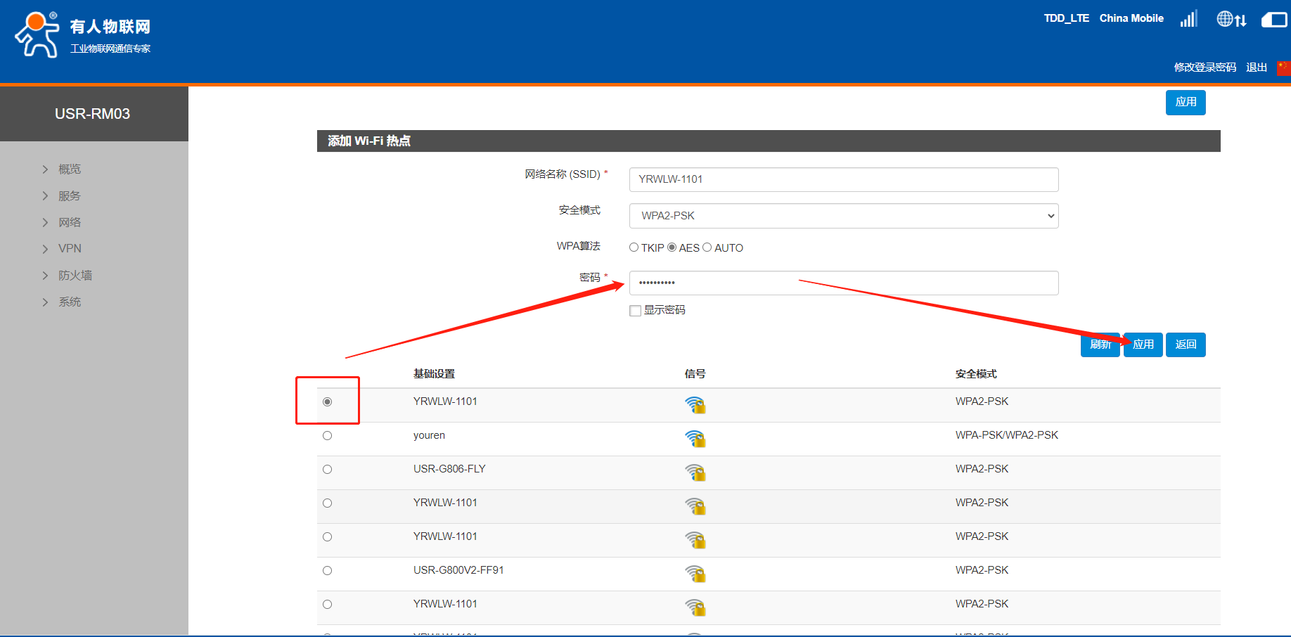 7. 選中想要連接的 AP 名稱,填入密碼。點擊應用進行添加