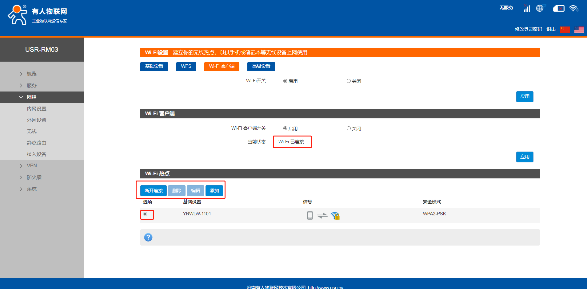 8. 添加完成需要連接的 AP 名稱后,接著選中,點擊“連接”,等待連接成功。連接成功后,WiFi 客戶端的 狀態則會顯示為“WiFi 已連接”,同時在 WiFi 熱點的狀態欄可以看到 STA 和 AP 連接成功