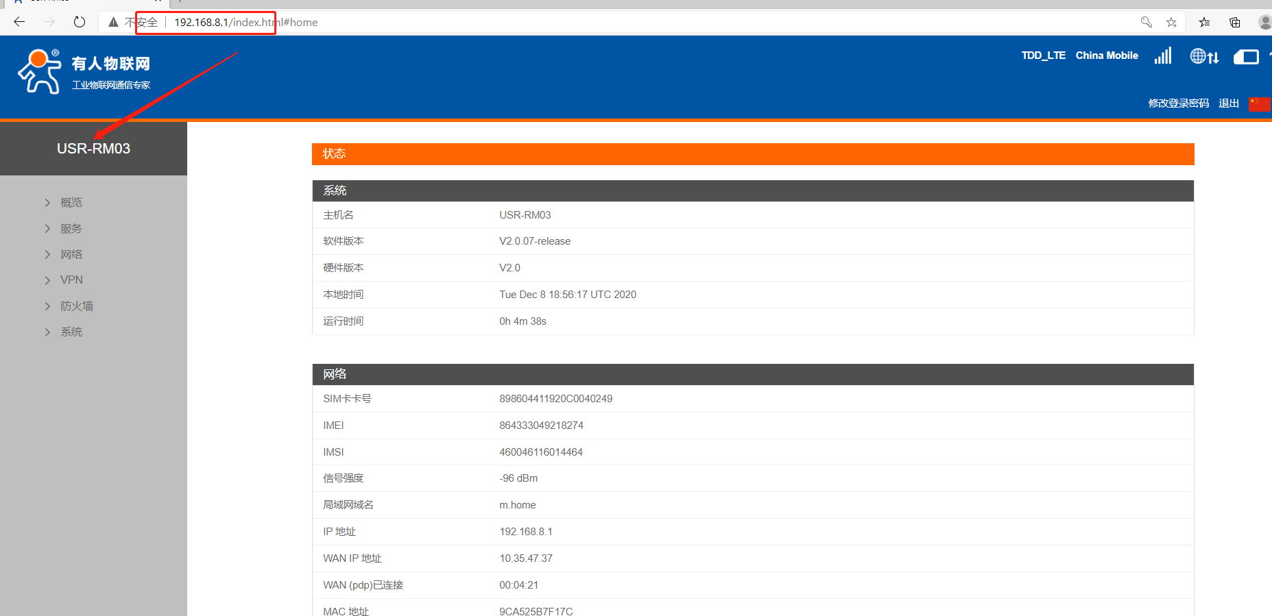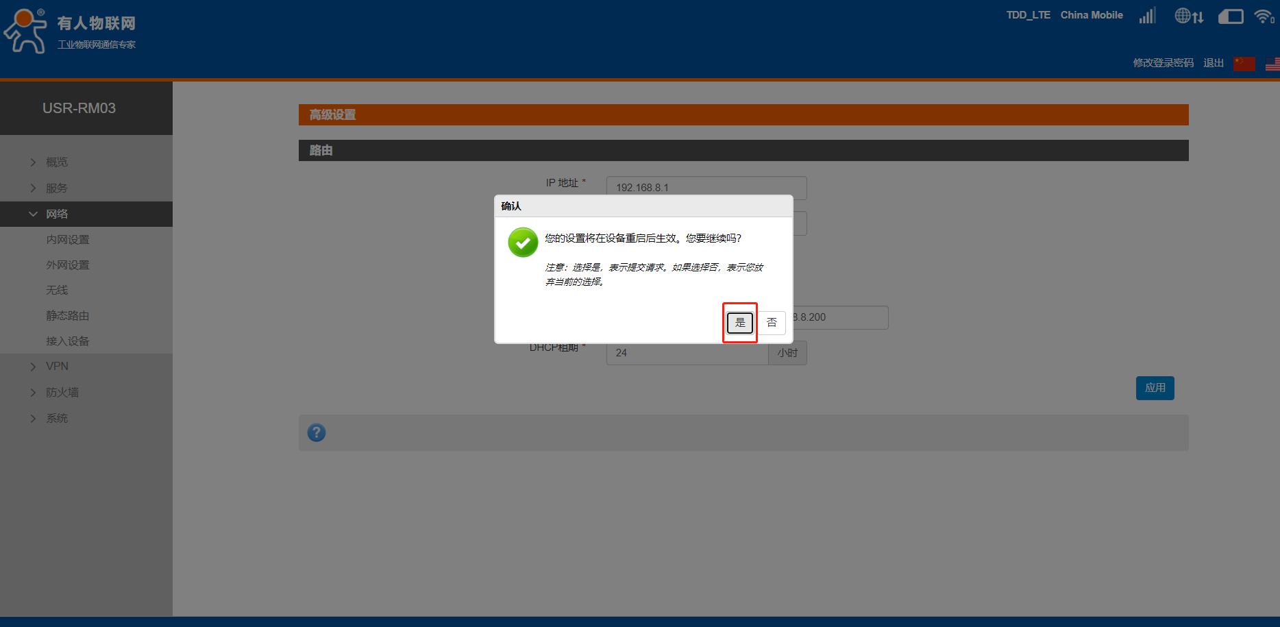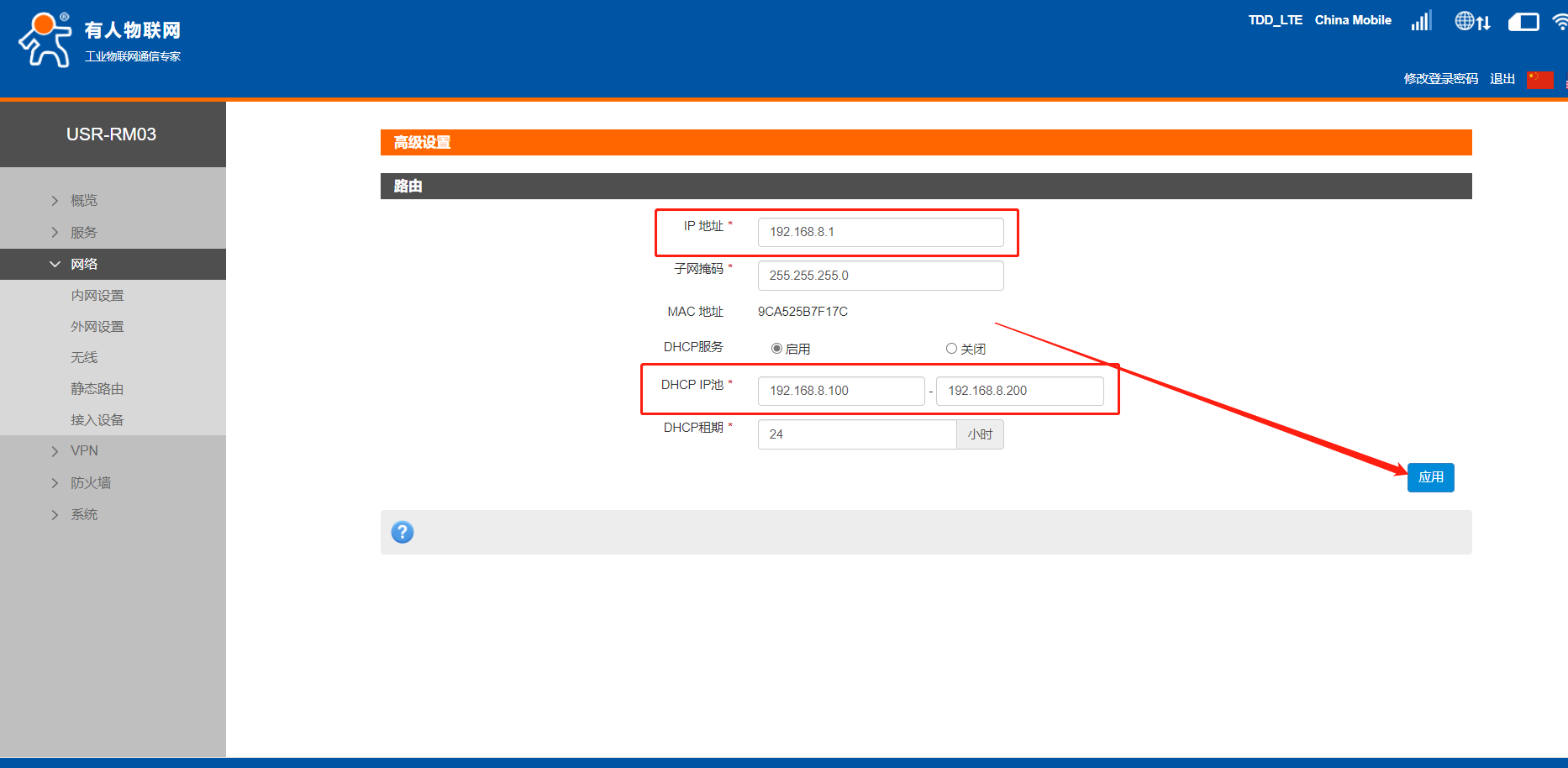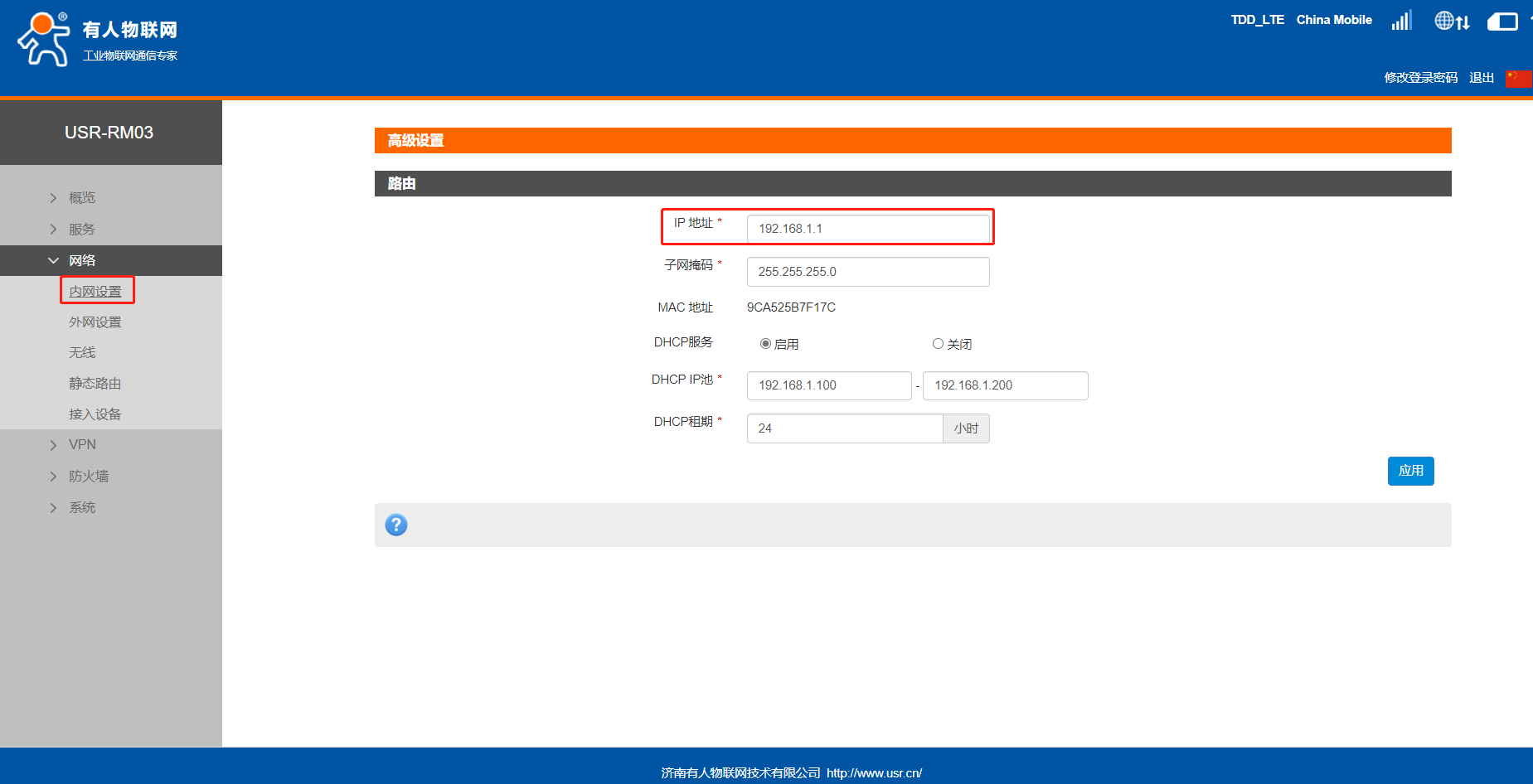 4、修改LAN口IP網段。進入網絡--內網設置,進入修改界面,出廠默認,RM03的LAN口IP為192.168.1.1
