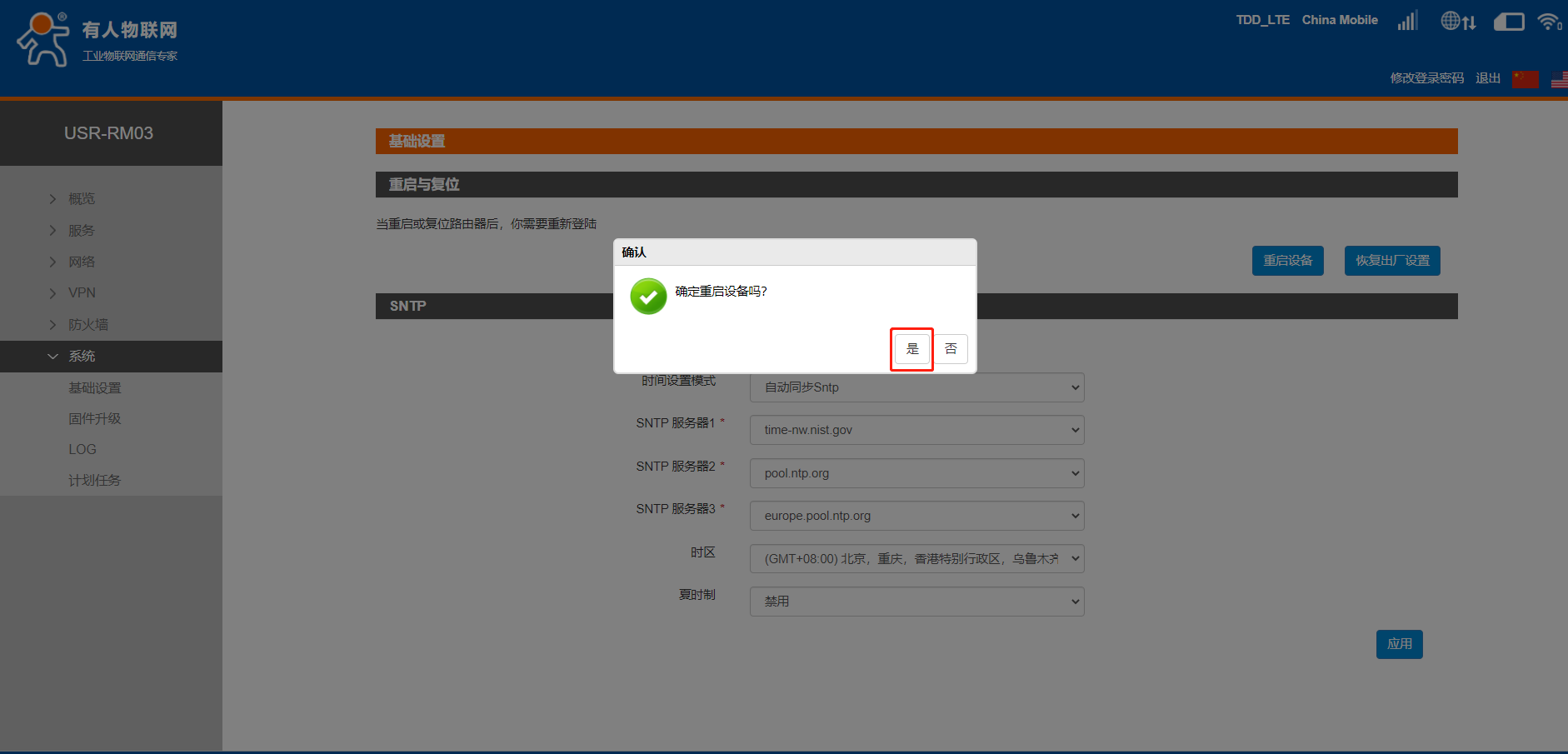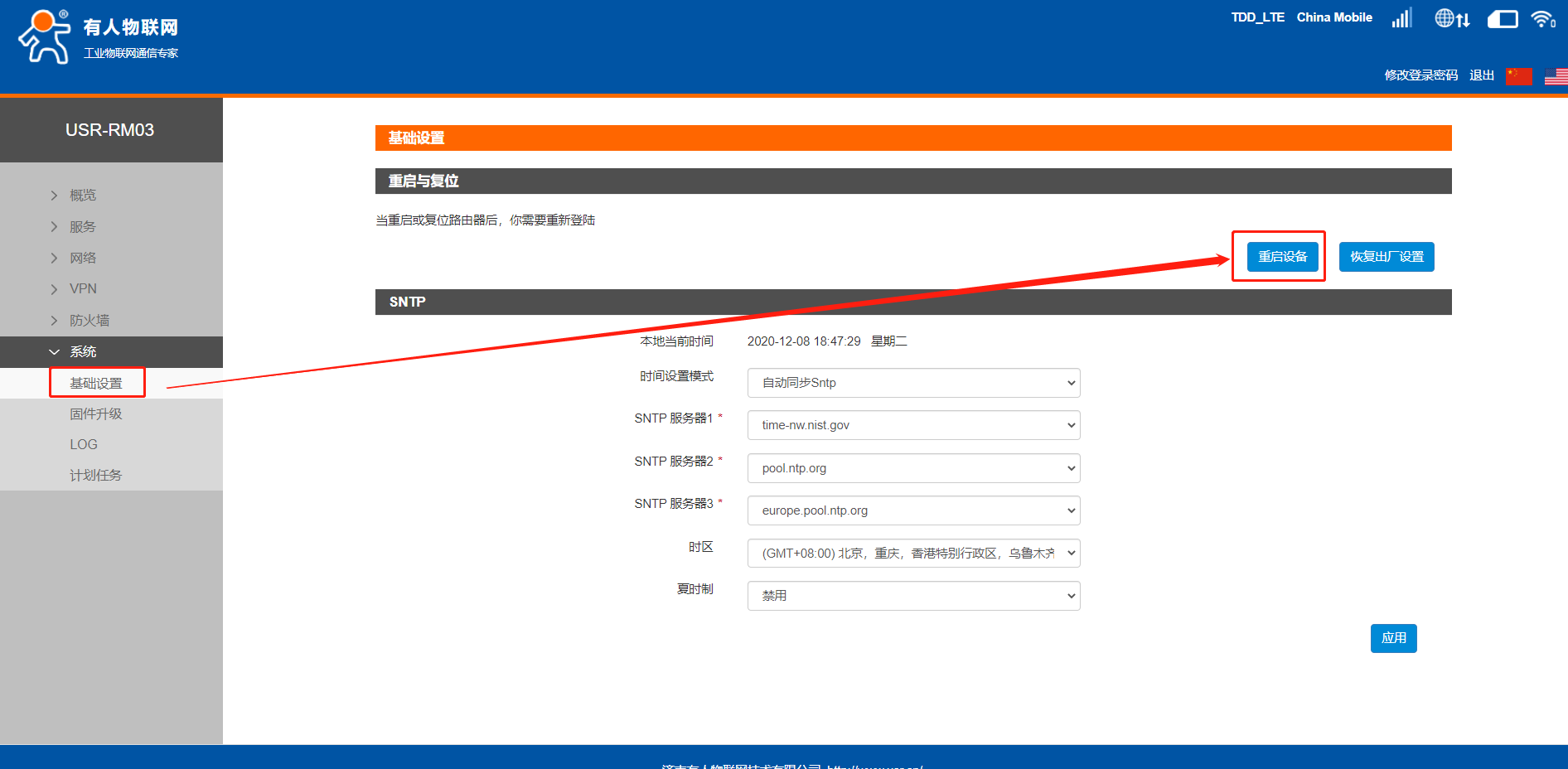 6、設置完參數后點擊系統--基礎設置--重啟設備。