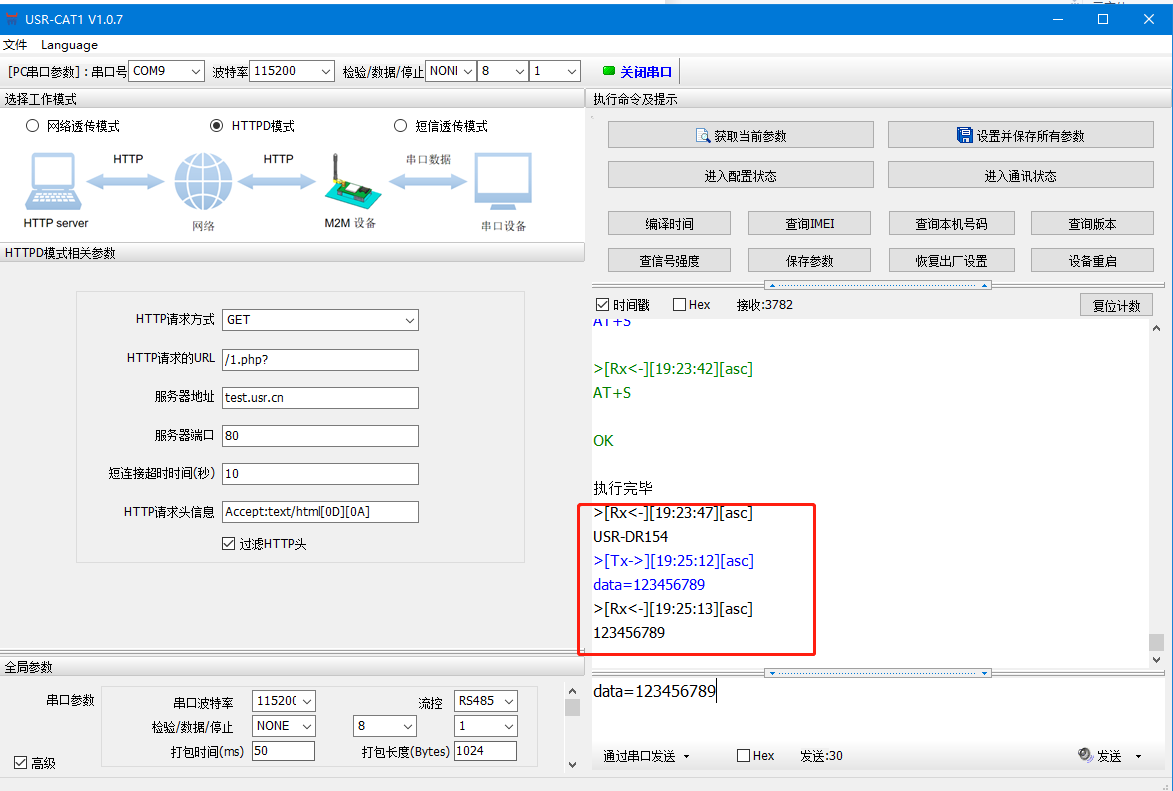 通過瀏覽器測試,發送的數據是123456789,服務器也返回了123456789,這個過程是單獨的測試服務器是否能正常工作,確定服務器是ok的,下面就是DTU和服務器的配合測試。