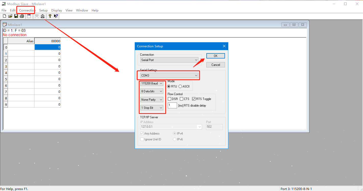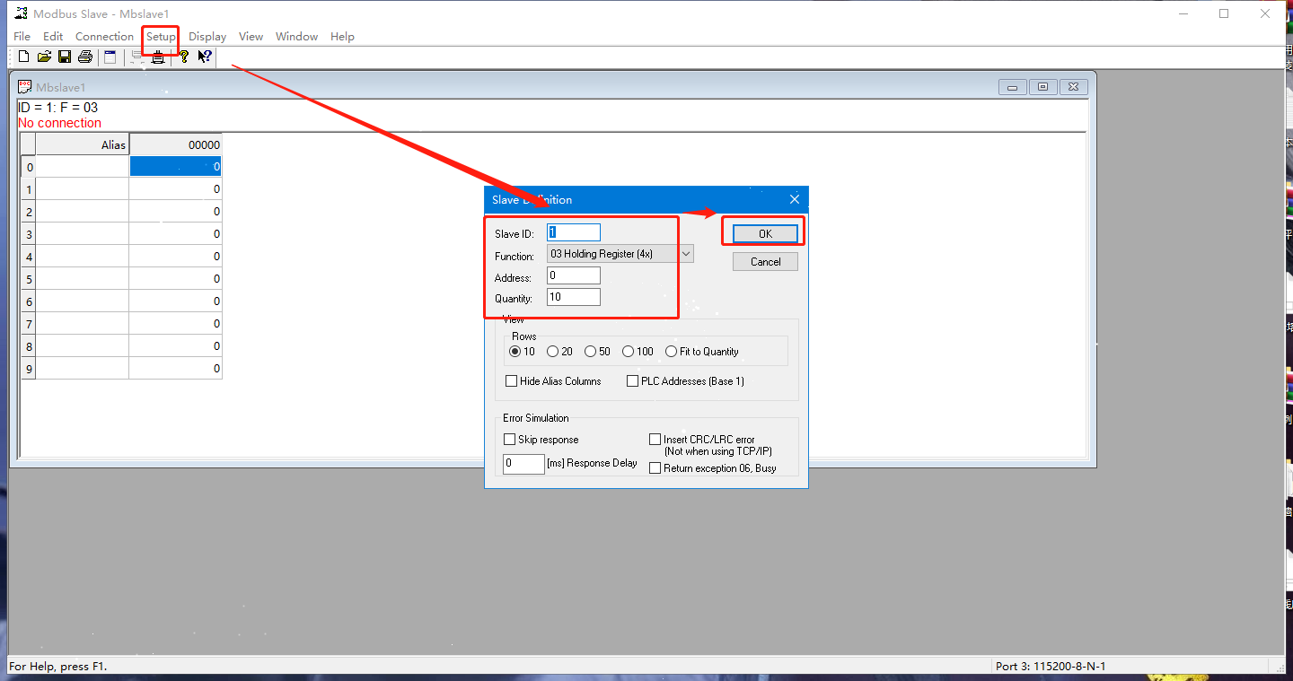 2. 打開MODBUS SLAVE軟件模擬從機,以相同的串口參數打開N580的串口。