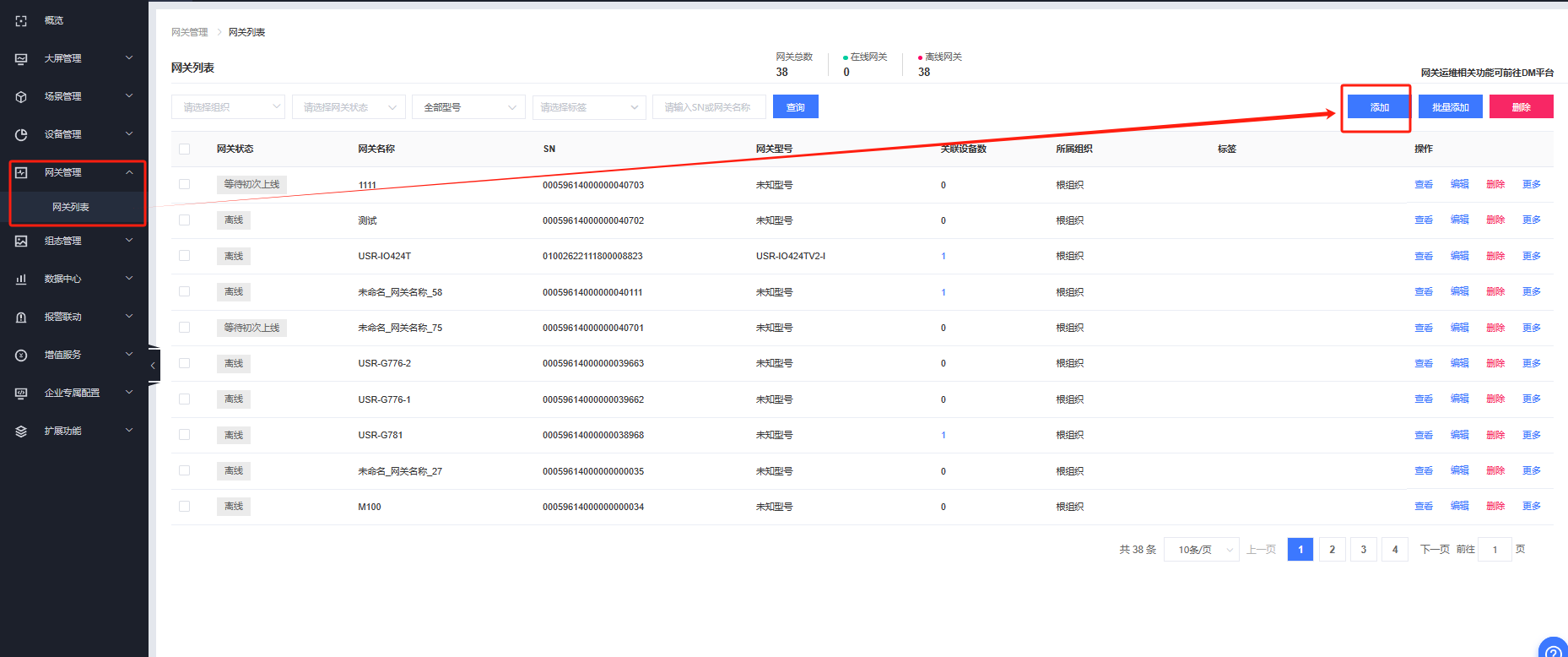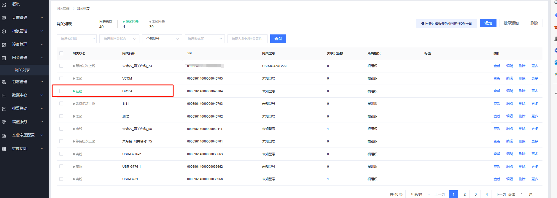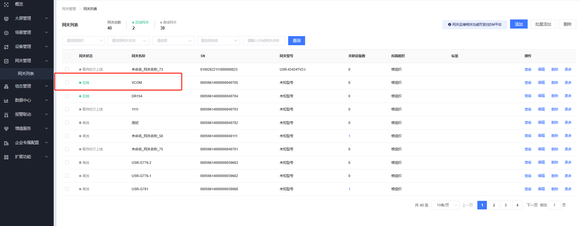 網關管理--網關列表--添加,選擇SN不支持的方式添加一個名為VCOM的網關,同時開啟有人云透傳功能